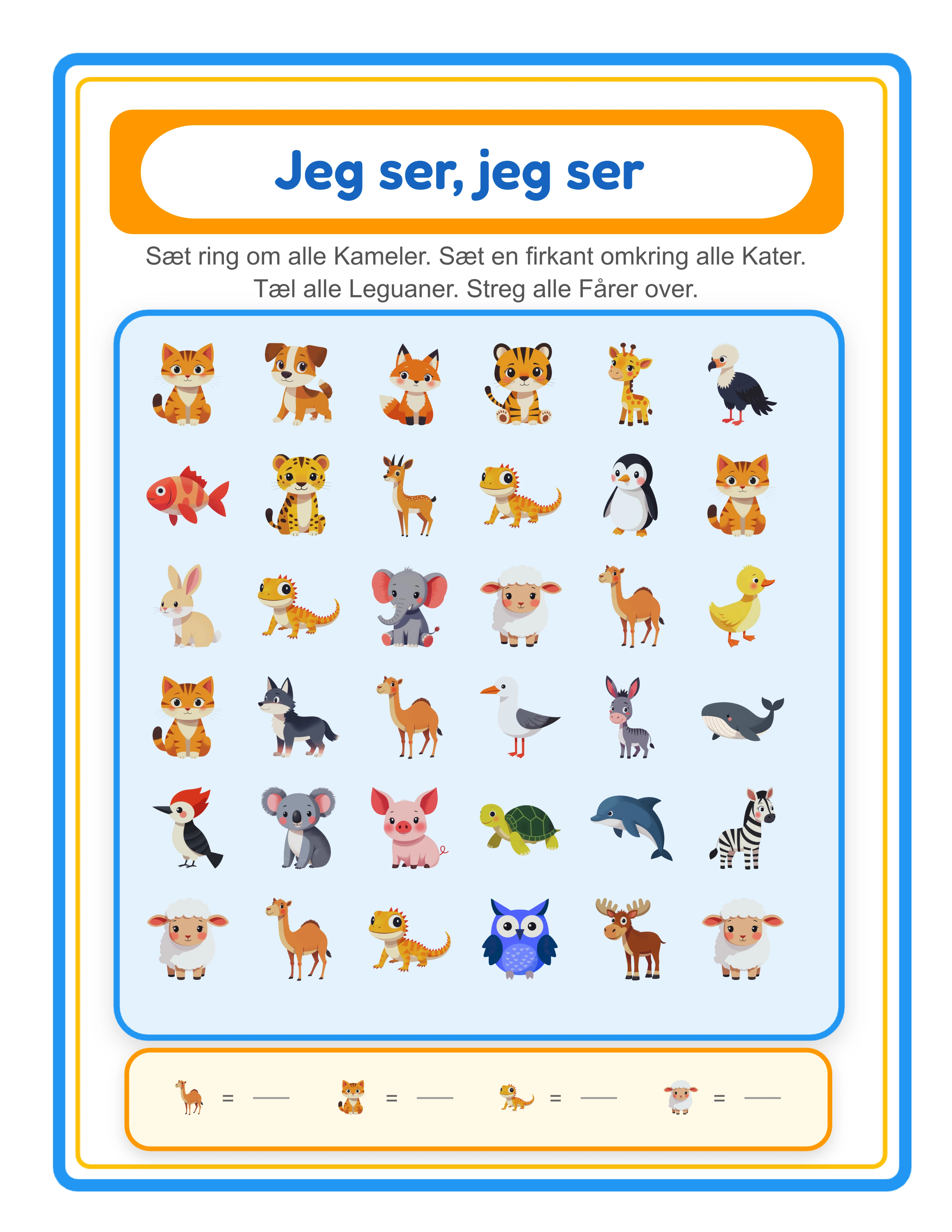 Fire opgavetyper: Ring om, Firkant, Streg over og Tæl — blandbare på ét arbejdsark