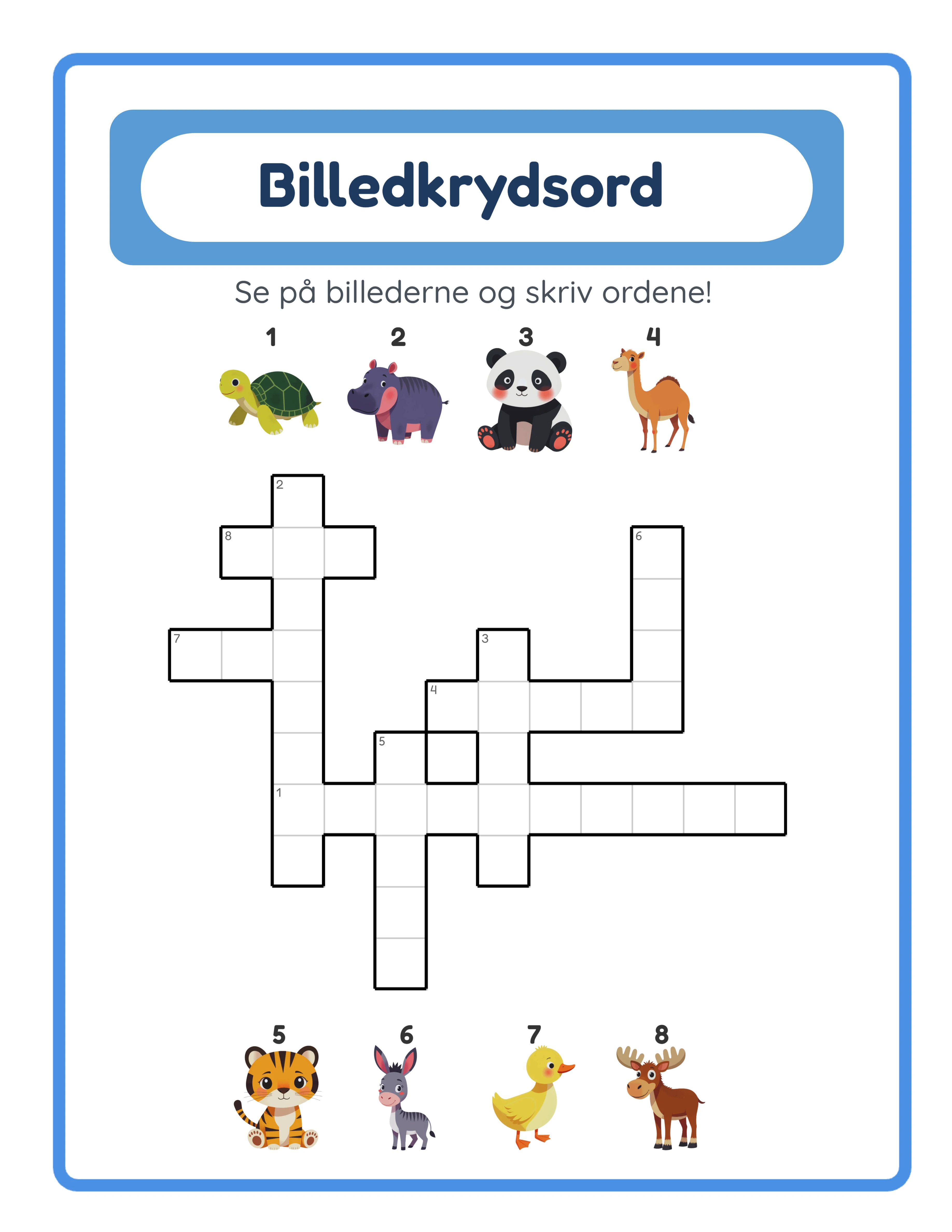 Lav krydsord med billedledetråde på et 15×15 gitter — fire indtastningsmetoder, automatisk facit og 104 temaer til børnehaveklasse, indskoling og mellemtrin.