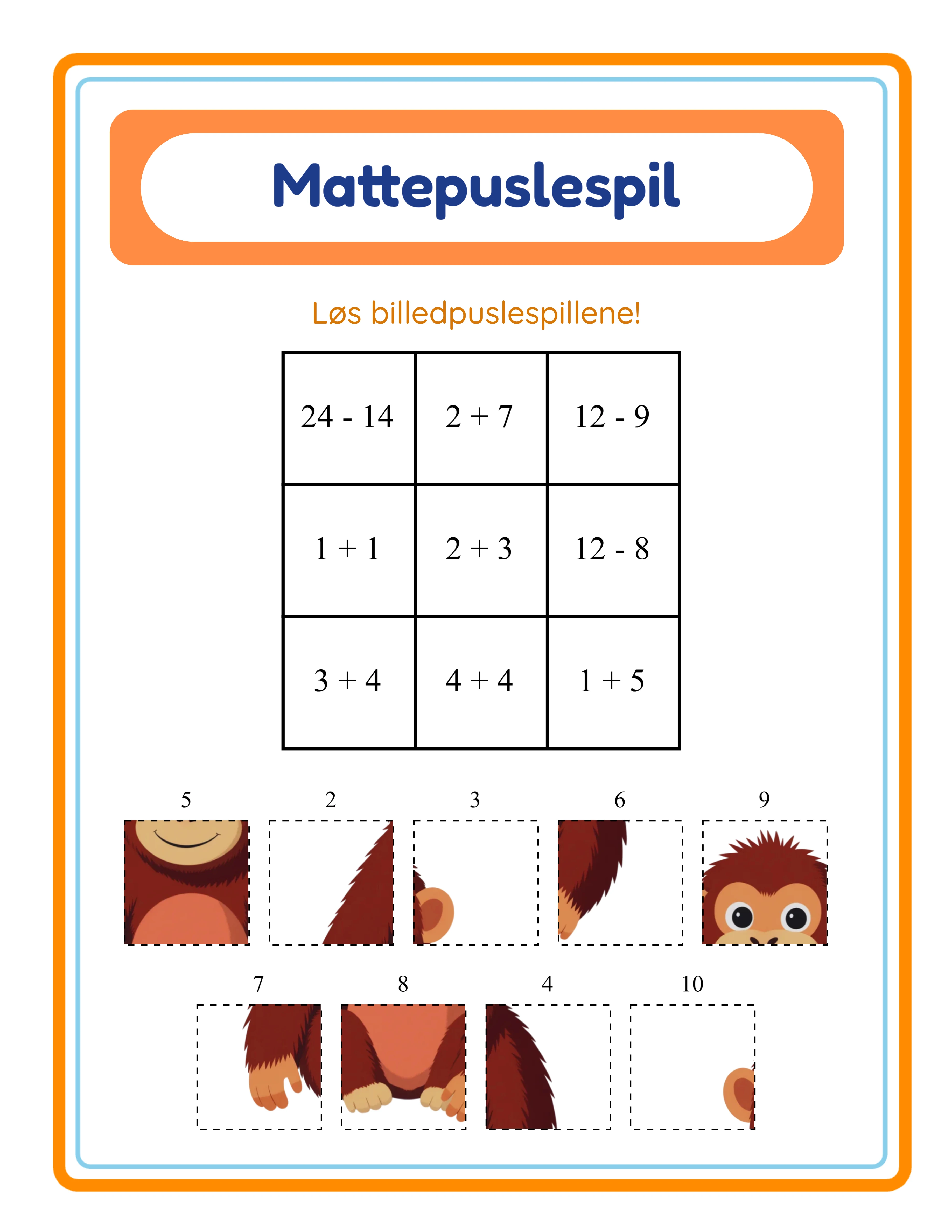 Lav sjove regneopgaver som puslespil — børnene løser stykker for at kombinere brikker og afsløre billedet.