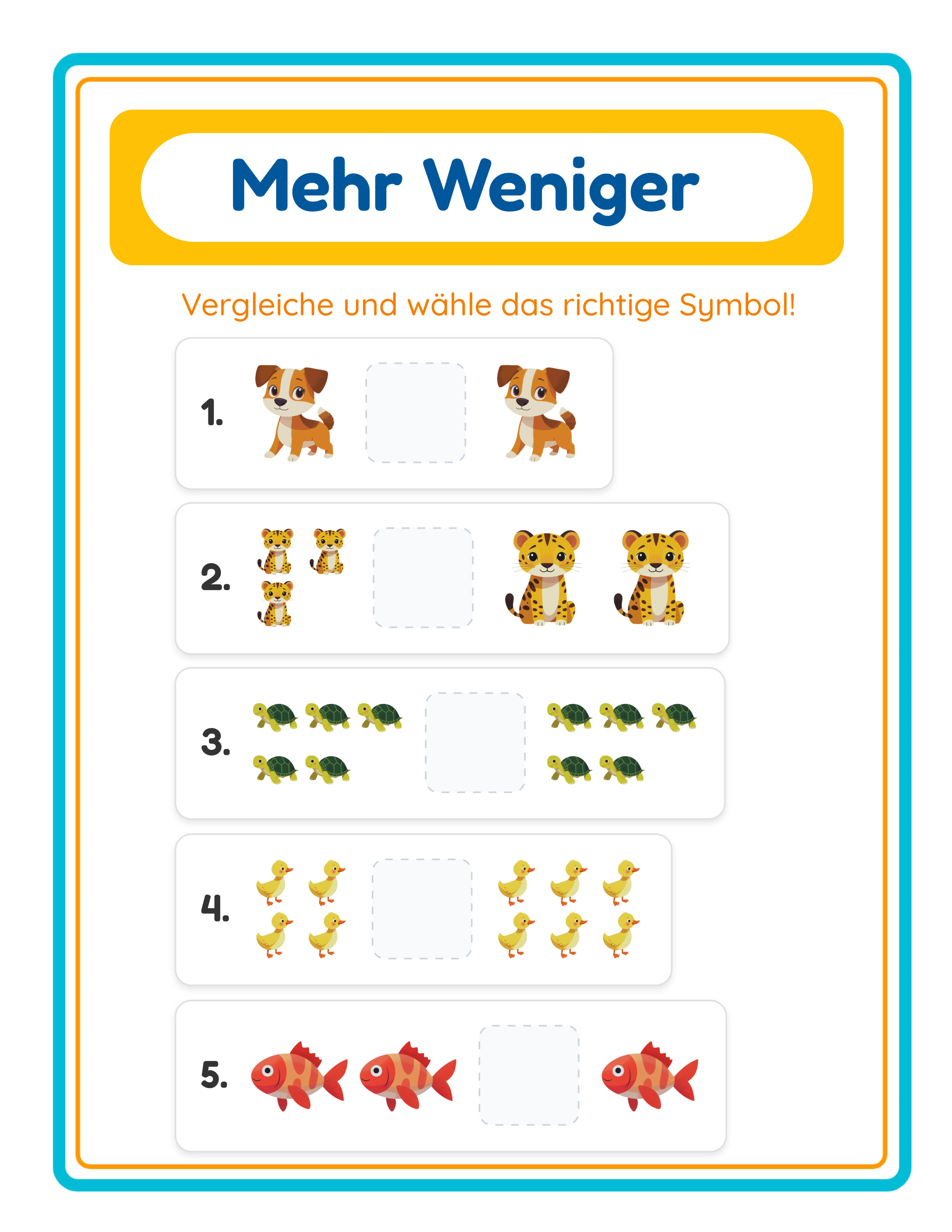 Bunte Arbeitsblätter zum Erkennen von mehr, weniger und gleich