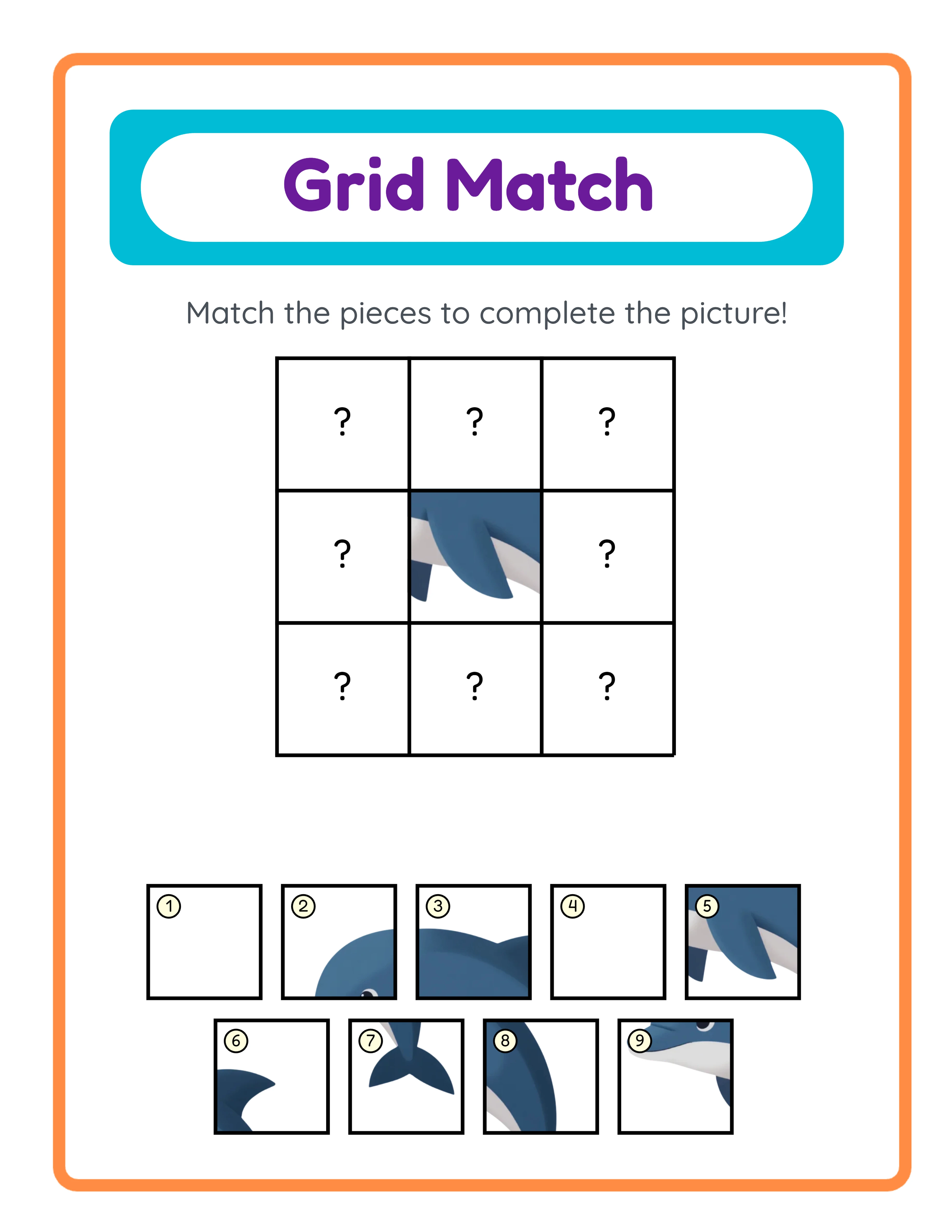 Create professional grid matching worksheets where a single image is divided into a grid of tiles and users match numbered tiles back to their correct positions — a spatial reasoning puzzle built from one picture. Configure the grid from 2×2 up to 4×4 (2–4 rows × 2–4 columns, default 3×3) to create puzzles ranging from 4 tiles to 16 tiles. Set 1–5 clue cells (default 1) that remain visible on the worksheet as hints — fewer clues mean harder puzzles, more clues create accessible warm-ups. The app shuffles hidden tiles using Fisher-Yates randomization and displays them in a numbered palette beside or below the grid, so every generation produces a different tile order even from the same image and settings. Solvers study the revealed clue cells, examine the numbered tiles in the palette, and write which number belongs in each empty cell. The dual-canvas system generates both a worksheet tab and an answer key tab simultaneously — the answer key displays the complete uncut image with numbered circles overlaid on each grid cell (yellow background #ffffe0, black outline, Fredoka font), showing exactly which palette number belongs in each position. The responsive layout adapts automatically: portrait pages place the grid on top (45% height) with the palette below; landscape pages position the grid on the left (48% width) with the palette on the right. A styled header appears with a cyan background (#00BCD4), deep purple title (#6A1B9A), and orange border frame (#FF8C42) displaying "Grid Match" and instructions in the selected language. Grid Match is NOT language-sensitive — the puzzle output is purely visual with no localized word content on the worksheet itself, making every worksheet universally sellable across all markets without translation. Browse 104 themed collections with 3,100+ illustrations or upload your own PNG, JPG, or GIF images for personalized grid puzzles. Apply background themes and border themes with independent opacity sliders (0–1, step 0.05). Export four files per session: worksheet JPEG, worksheet PDF, answer key JPEG, and answer key PDF — all at 300 DPI. Choose Letter, A4, or custom page sizes with a grayscale toggle for ink-friendly output. Edit everything on the Fabric.js canvas with 7 fonts, text outline 0–10, alignment tools, layers, lock/unlock, zoom 25%–300%, and undo/redo 20 states. The free trial includes every feature with a watermark on downloads. Purchase a license to remove the watermark and sell commercially.
