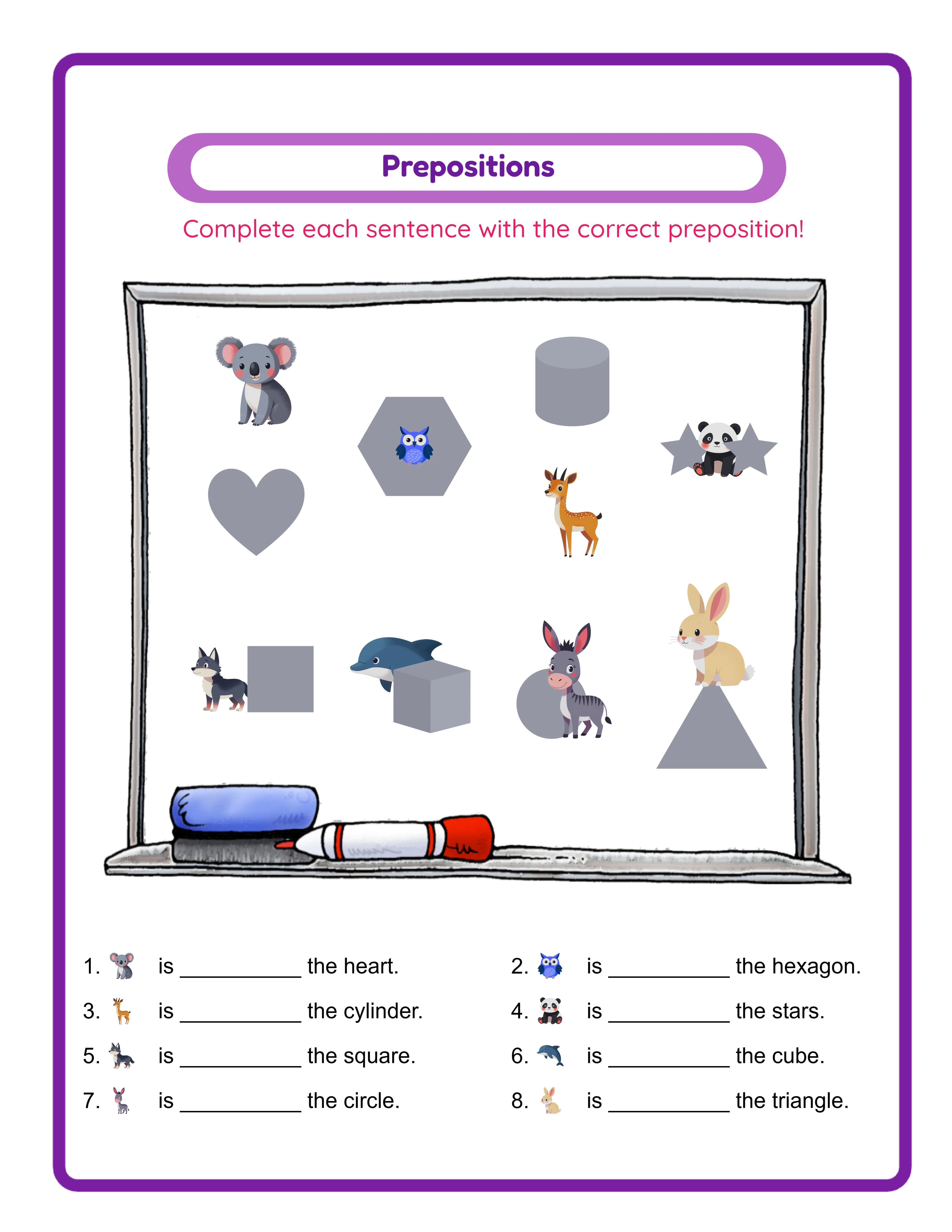 Build position-word exercises that engage solvers through image-based scenes. This tool generates prepositions worksheets where learners identify spatial relationships — on, under, above, beside, between, inside, outside — by studying image scenes and filling in or selecting the correct preposition. Choose between two exercise modes: Fill-in-the-Blank, where solvers write the correct preposition themselves, or Multiple Choice, where they pick from a set of options with a customizable instruction line. Set 1–8 exercises per worksheet and select exactly which prepositions to include using the checkbox grid. The tool's standout feature is Shape Replacement — a separate image layer lets you swap scene shapes independently, creating far more visual combinations than a single image set could offer. Language sensitivity is built in: switch from English to any of the 11 supported languages and every preposition word updates to its native equivalent. German uses "auf, unter, über, neben, zwischen, drinnen, draußen"; French uses "sur, sous, au-dessus, à côté, entre, dedans, dehors". One worksheet design becomes 11 unique language products. Browse 3,100+ images across 104 themes, upload your own PNG or JPEG for branded designs, and choose from multiple templates and 7 font families. Export as print-ready PDF or high-resolution JPEG. The free trial includes a watermark on downloads. Purchase a license to remove the watermark and sell commercially.