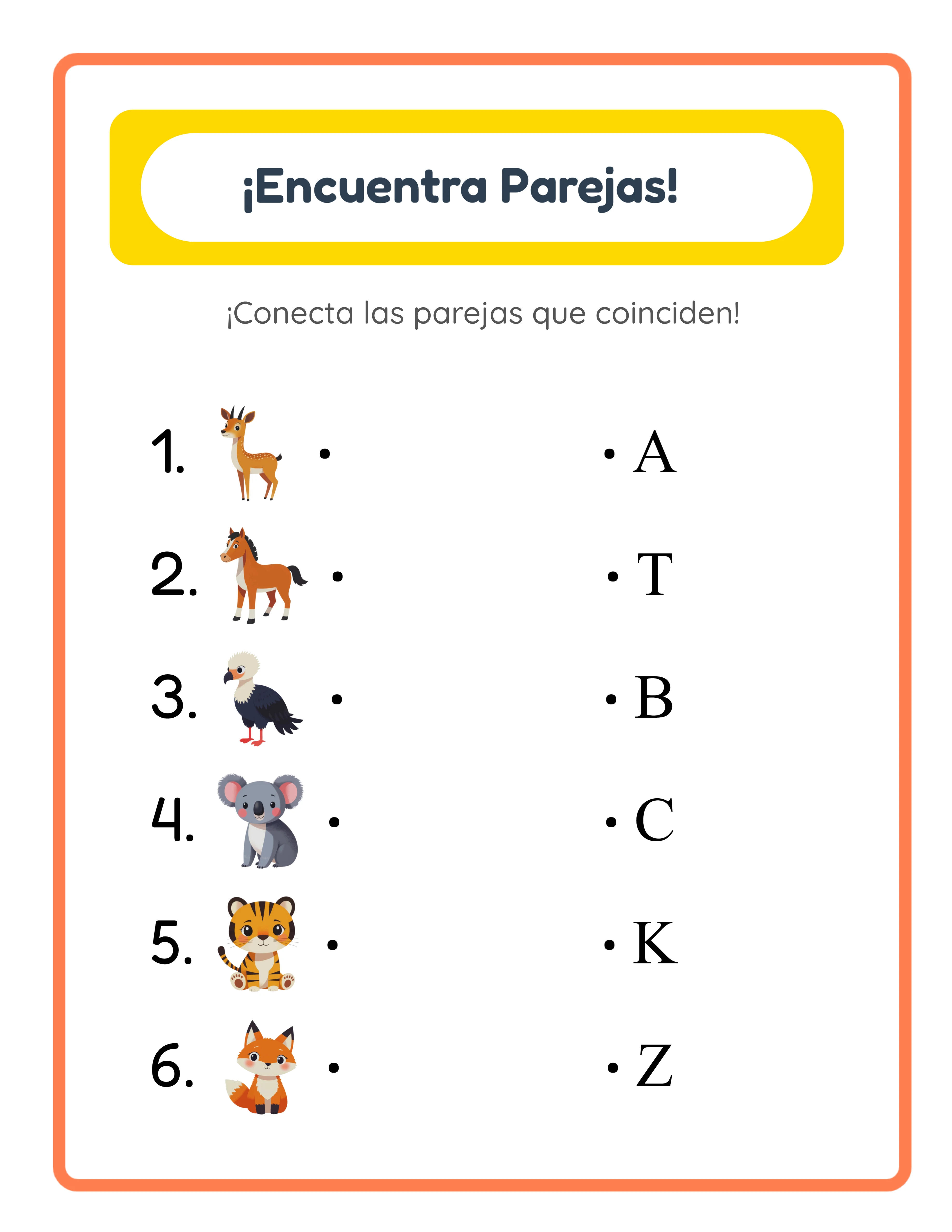 Crea fichas profesionales de asociación trazando líneas donde los usuarios conectan pares dibujando líneas entre dos columnas — con cuatro modos de asociación distintos en un solo generador. El modo Letra Inicial coloca imágenes a la izquierda y sus primeras letras a la derecha, con tres sub-modos: Tema e Imágenes Aleatorios selecciona un tema e imágenes automáticamente, Aleatorio del Tema Elegido te permite elegir el tema, y Seleccionar Imágenes Específicas te da control manual sobre cada imagen. Alterna entre mayúsculas o minúsculas para fichas apropiadas según la edad. El modo Imagen y Palabra muestra pares de imágenes etiquetadas en ambos lados para refuerzo de vocabulario. El modo Imagen/Palabra Mixto usa selectores desplegables por fila para que cada lado muestre independientemente una imagen o una palabra, creando dificultad variada dentro de una sola ficha. El modo Palabra Personalizada empareja imágenes con tus propios términos escritos para práctica de ortografía, ejercicios de vocabulario o ejercicios de idiomas extranjeros. Configura 4, 5 o 6 pares por ficha (por defecto 6) para controlar la dificultad y densidad visual. Activa los números de elementos (por defecto activado) para añadir numerales antes de cada par y muestra puntos decorativos (por defecto activado) para formato decorativo — ambos controlables independientemente. Cada ficha incluye un encabezado autogenerado localizado "¡Relaciona!" con fondo de pastilla amarilla (#FFD700), marco de borde coral (#FF7F50, trazo de 8px), título en Fredoka (700) y descripción en Quicksand (500), traducido automáticamente a los 11 idiomas soportados. El sistema de lienzo dual genera simultáneamente una pestaña de ficha y una pestaña de clave de respuestas — la clave de respuestas dibuja líneas de conexión horizontales (#555, ancho de trazo 2) entre los pares correctos para que nunca la crees manualmente. Este generador es sensible al idioma: los modos Letra Inicial e Imagen y Palabra usan nombres de imágenes localizados, por lo que cambiar el idioma cambia las palabras y primeras letras en la ficha. Navega 104 colecciones temáticas con más de 3.100 ilustraciones. Aplica fondos temáticos y bordes temáticos con controles de opacidad independientes (0–1, paso 0,05). Añade campos de nombre y fecha con una sola casilla de verificación. Exporta cuatro archivos por sesión: ficha JPEG, ficha PDF, clave de respuestas JPEG y clave de respuestas PDF — todo a 300 DPI. Elige Carta, A4, Cuadrado (1200×1200) o tamaños personalizados con opción de escala de grises para salida con ahorro de tinta. Edita todo en el lienzo de Fabric.js con 7 fuentes, contorno de texto 0–10, herramientas de alineación, capas, bloqueo/desbloqueo, zoom 25%–300% y deshacer/rehacer 20 estados. La prueba gratuita incluye todas las funciones con una marca de agua en las descargas. Compra una licencia para eliminar la marca de agua y vender con uso comercial.