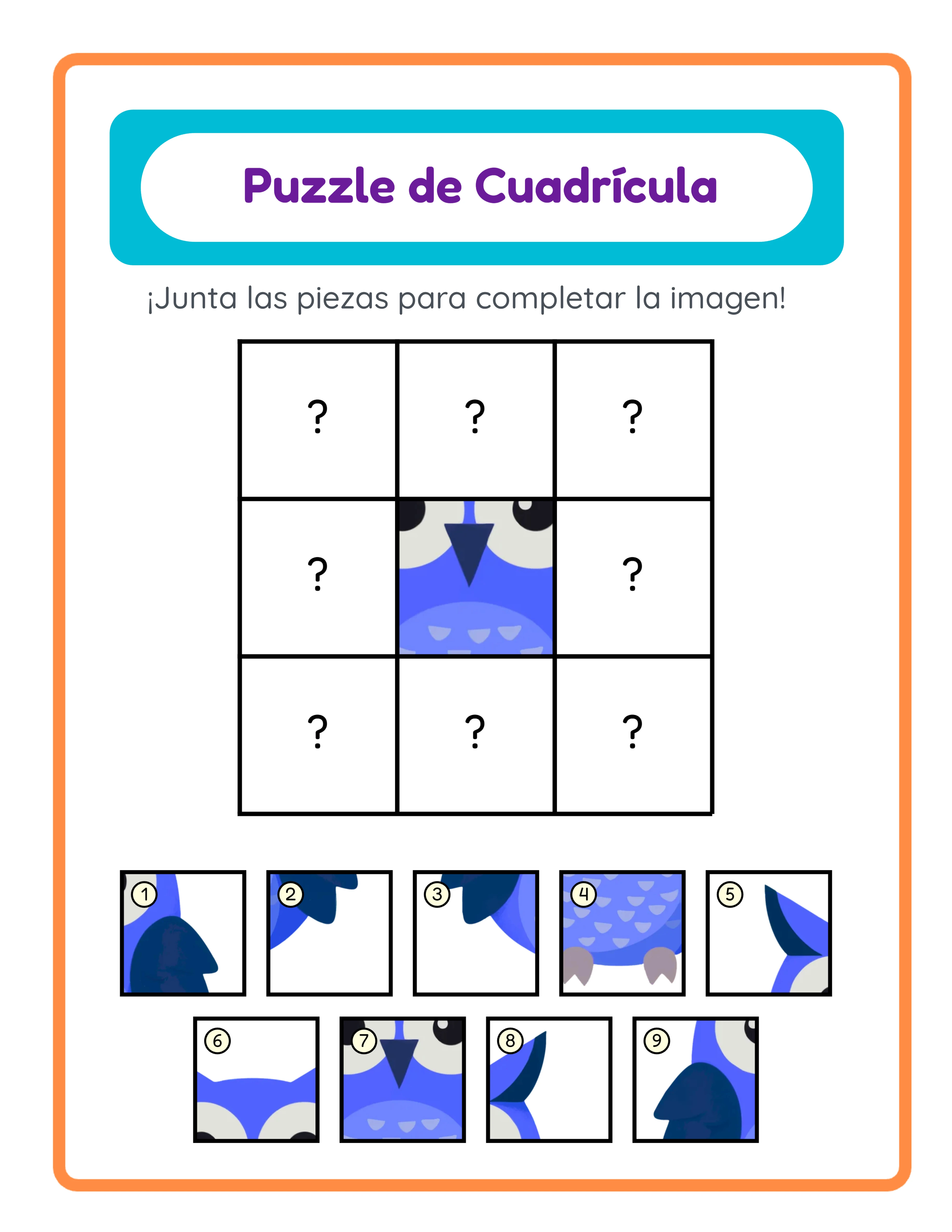 Crea fichas profesionales de puzzle de cuadrícula donde una sola imagen se divide en una cuadrícula de piezas y los usuarios asocian las piezas numeradas con sus posiciones correctas — un rompecabezas de razonamiento espacial construido a partir de una sola imagen. Configura la cuadrícula de 2×2 hasta 4×4 (2–4 filas × 2–4 columnas, por defecto 3×3) para crear puzzles que van desde 4 piezas hasta 16 piezas. Establece de 1 a 5 celdas pista (por defecto 1) que permanecen visibles en la ficha como pistas — menos pistas significan puzzles más difíciles, más pistas crean calentamientos accesibles. La aplicación baraja las piezas ocultas usando aleatorización Fisher-Yates y las muestra en una paleta numerada junto a o debajo de la cuadrícula, de modo que cada generación produce un orden de piezas diferente incluso con la misma imagen y configuración. Los usuarios estudian las celdas pista reveladas, examinan las piezas numeradas en la paleta y escriben qué número pertenece a cada celda vacía. El sistema de lienzo dual genera simultáneamente una pestaña de ficha y una pestaña de clave de respuestas — la clave de respuestas muestra la imagen completa sin cortar con círculos numerados superpuestos en cada celda de la cuadrícula (fondo amarillo #ffffe0, contorno negro, fuente Fredoka), mostrando exactamente qué número de la paleta corresponde a cada posición. El diseño responsivo se adapta automáticamente: páginas en vertical colocan la cuadrícula arriba (45% de altura) con la paleta debajo; páginas en horizontal posicionan la cuadrícula a la izquierda (48% de ancho) con la paleta a la derecha. Un encabezado estilizado aparece con fondo cian (#00BCD4), título en púrpura profundo (#6A1B9A) y marco de borde naranja (#FF8C42) mostrando "Puzzle de Cuadrícula" e instrucciones en el idioma seleccionado. El Puzzle de Cuadrícula NO es sensible al idioma — la salida del puzzle es puramente visual sin contenido de texto localizado en la ficha, haciendo cada ficha universalmente vendible en todos los mercados sin traducción. Navega 104 colecciones temáticas con más de 3.100 ilustraciones o sube tus propias imágenes PNG, JPG o GIF para puzzles de cuadrícula personalizados. Aplica fondos temáticos y bordes temáticos con controles de opacidad independientes (0–1, paso 0,05). Exporta cuatro archivos por sesión: ficha JPEG, ficha PDF, clave de respuestas JPEG y clave de respuestas PDF — todo a 300 DPI. Elige Carta, A4 o tamaños personalizados con opción de escala de grises para salida con ahorro de tinta. Edita todo en el lienzo de Fabric.js con 7 fuentes, contorno de texto 0–10, herramientas de alineación, capas, bloqueo/desbloqueo, zoom 25%–300% y deshacer/rehacer 20 estados. La prueba gratuita incluye todas las funciones con una marca de agua en las descargas. Compra una licencia para eliminar la marca de agua y vender con uso comercial.