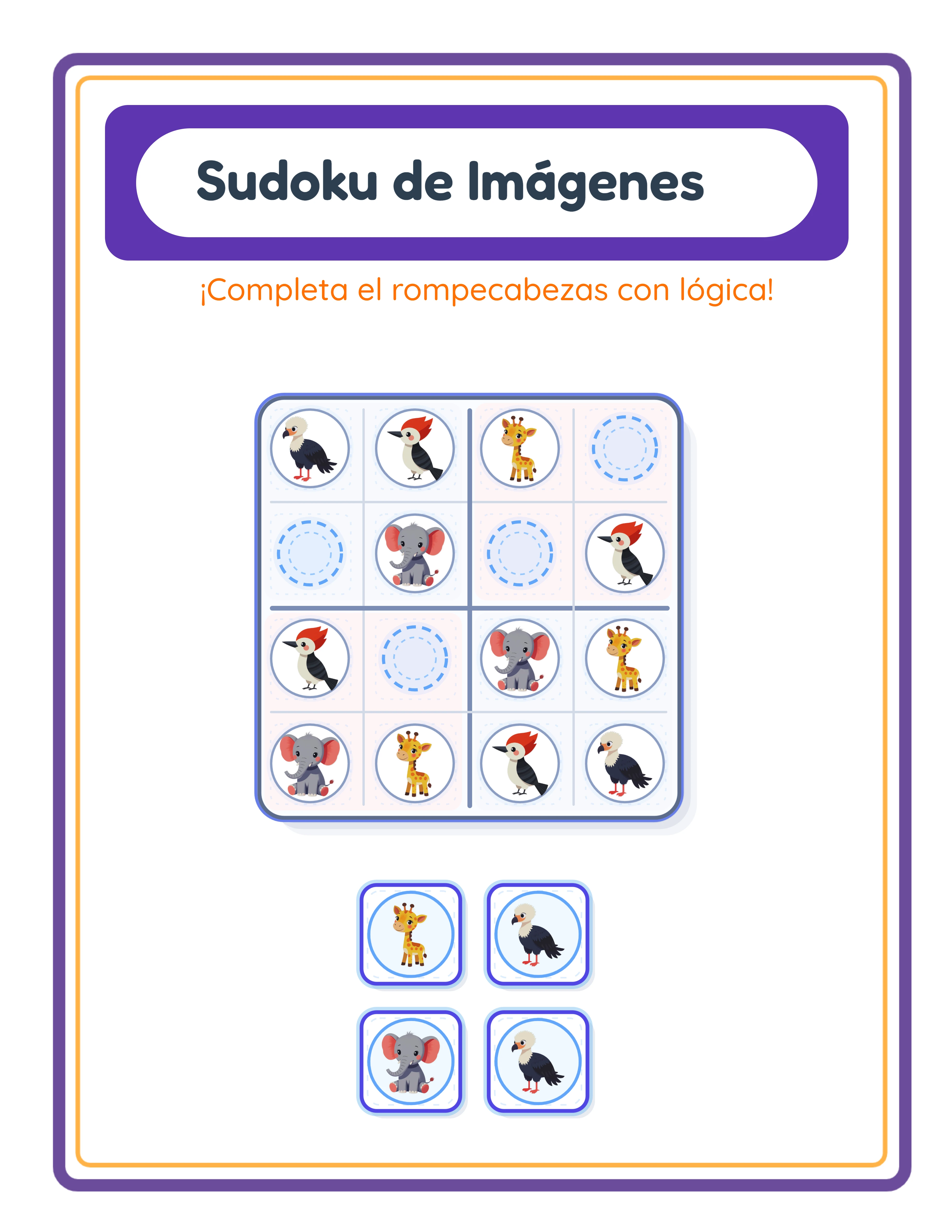 Crea fichas profesionales de sudoku con imágenes donde los usuarios completan las celdas vacías con la imagen correcta usando lógica de filas y columnas en una cuadrícula 4×4. Cada puzzle usa exactamente 4 imágenes únicas que deben aparecer una vez en cada fila y una vez en cada columna — las mismas reglas que el sudoku clásico, pero con ilustraciones coloridas en lugar de números. Tres niveles de dificultad controlan el desafío: Fácil elimina 4 celdas, Medio elimina 6 y Difícil elimina 8 — la mitad de la cuadrícula. Selecciona imágenes mediante selección por tema que elige automáticamente 4 imágenes al azar de cualquiera de las 104 colecciones temáticas, o navega manualmente, busca y sube para elegir exactamente 4 imágenes. El diseño premium de la cuadrícula presenta colores de bloque 2×2 alternos en azul claro (#F8F9FC) y rosa claro (#FFF5F7), divisores centrales en negrita (#7C8DB5, trazo de 3px), líneas internas más finas (#D1D9E6, 1,5px), un borde exterior índigo (#667EEA) con esquinas redondeadas de 18px y tres sombras multicapa para profundidad. Las imágenes se muestran al 65% del tamaño de la celda para una separación visual clara. Cada puzzle genera un encabezado estilizado "Sudoku con Imágenes" con fondo púrpura (#5E35B1) y texto del título localizado en los 11 idiomas soportados. El sistema de doble lienzo crea simultáneamente una pestaña de ficha y una pestaña de clave de respuestas — la clave de respuestas muestra la cuadrícula 4×4 completa con las 16 celdas rellenadas. Aplica temas de fondo y temas de borde con controles de opacidad independientes (0–1, paso 0,05). Añade texto personalizado con 7 opciones de fuente (Lexend Deca, Baloo 2, Nunito, Quicksand, Fredoka, Arial, Verdana) y contorno de texto de 0 a 10. Exporta PDF y JPEG listos para imprimir a 300 DPI (multiplicador 6×) en Carta Vertical, Carta Horizontal, A4 Vertical, A4 Horizontal o dimensiones personalizadas — sin tamaño Cuadrado en esta aplicación. Activa la escala de grises para impresión que ahorra tinta. Edita todo en el lienzo Fabric.js con 6 opciones de alineación más centrar en página, capas, bloquear/desbloquear, zoom del 25% al 300% en incrementos del 25%, y deshacer/rehacer con 50 estados. Como el sudoku con imágenes es completamente visual — ninguna palabra aparece en la cuadrícula del puzzle — cada ficha funciona de forma idéntica en los 11 idiomas, haciendo tus productos vendibles en todo el mundo. La prueba gratuita incluye todas las funciones con una marca de agua en las descargas. Compra una licencia para eliminar la marca de agua y vender comercialmente.