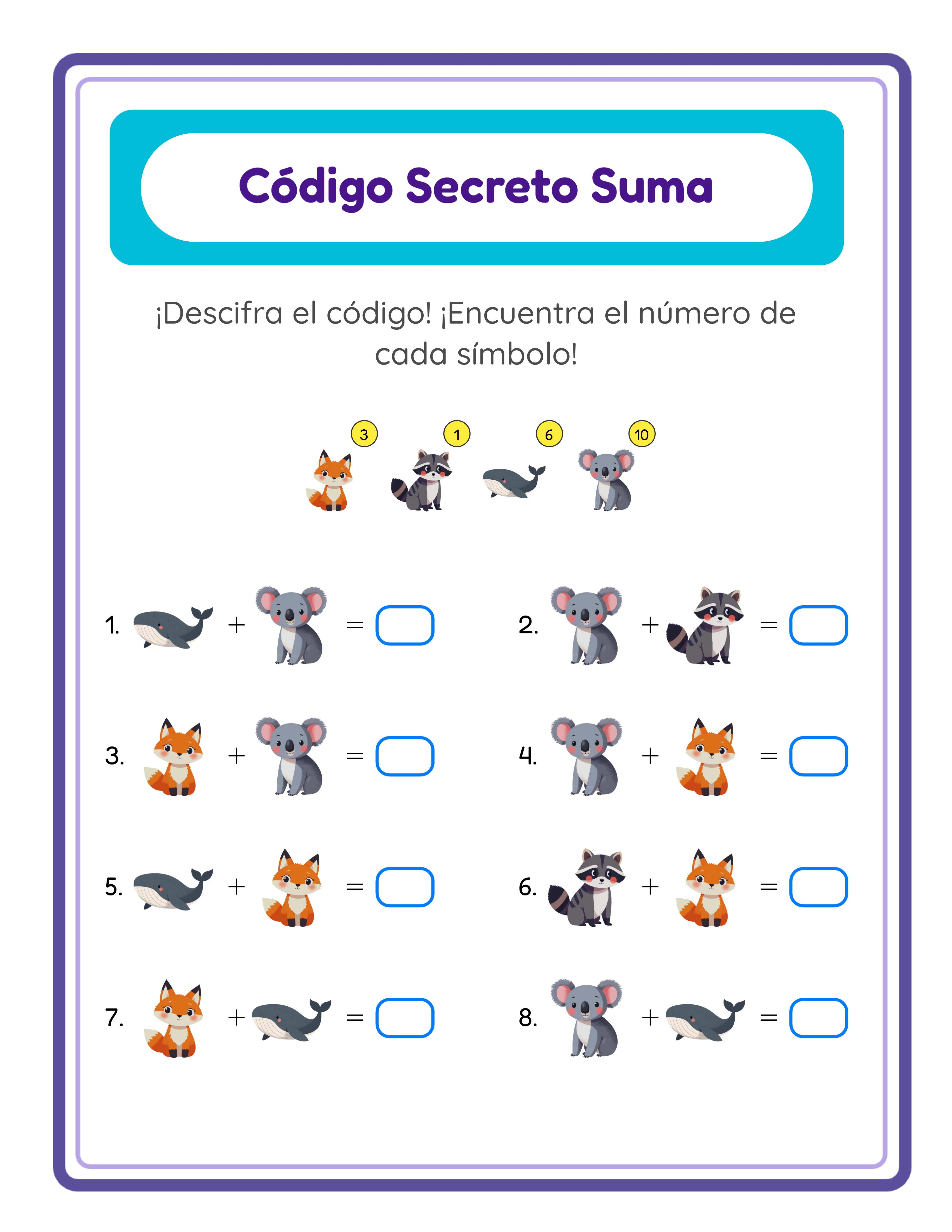 Esto no es una ficha de suma más — es un desafío de descifrado. Cada puzzle esconde números detrás de símbolos con imágenes, y los usuarios deben resolver ecuaciones de suma para averiguar qué número corresponde a cada imagen. En Modo Regular, cada símbolo representa un dígito único. Cambia al Modo Descubrir Palabra y cada ecuación resuelta revela una letra de una palabra secreta, mientras que letras distractoras mantienen a los usuarios en suspenso. Elige entre más de 100 temas de imágenes, ajusta la cantidad de símbolos y la complejidad de los sumandos, y descarga PDF o JPEG listos para imprimir. Compatible con 11 idiomas con alfabetos adaptados a cada lengua — el Modo Descubrir Palabra funciona de forma nativa en español con á, é, í, ó, ú, ñ y ü. La prueba gratuita incluye una marca de agua en las descargas. Compra una licencia para eliminar la marca de agua y vender tus creaciones con uso comercial.