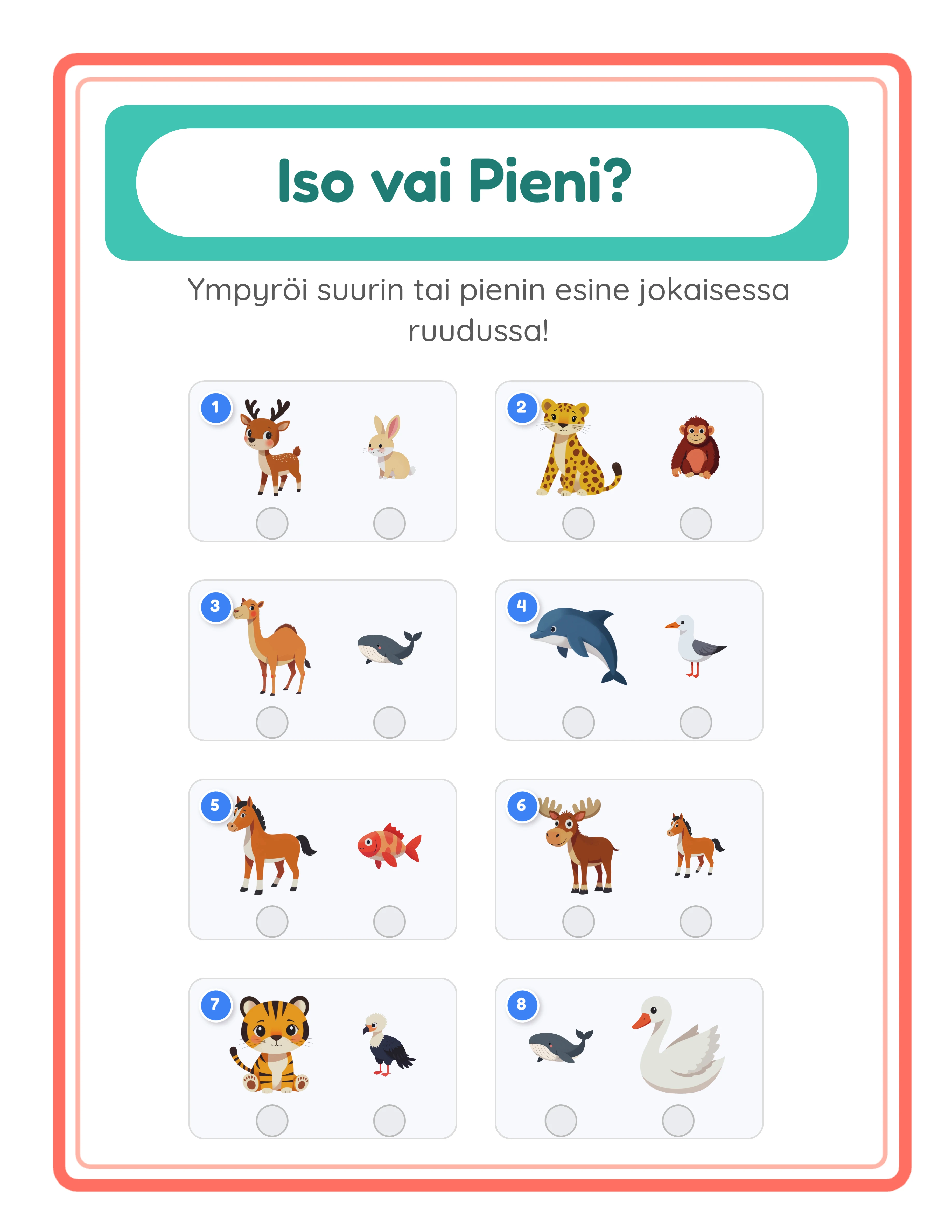 Viisi kysymystyyppiä — ympyröi iso, ympyröi pieni, ympyröi keskikokoinen, numeroi nouseva, numeroi laskeva — identtisillä ja eri kuvatiloilla visuaaliseen kokoerotteluun.