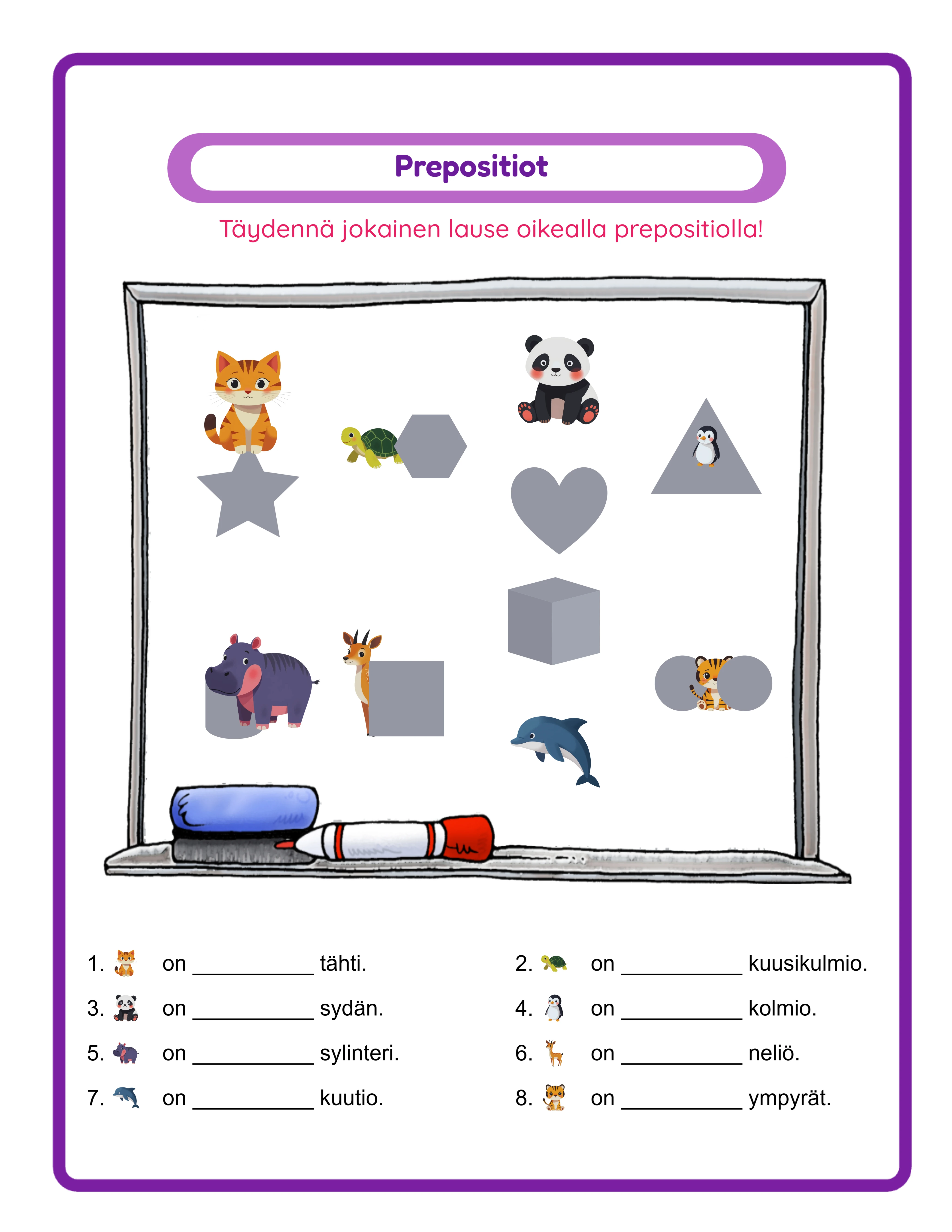Kahdeksan paikkasanaa kohtaavat kuva-ja-muoto-harjoitukset — rakenna paikkasanastoa lause lauseelta.