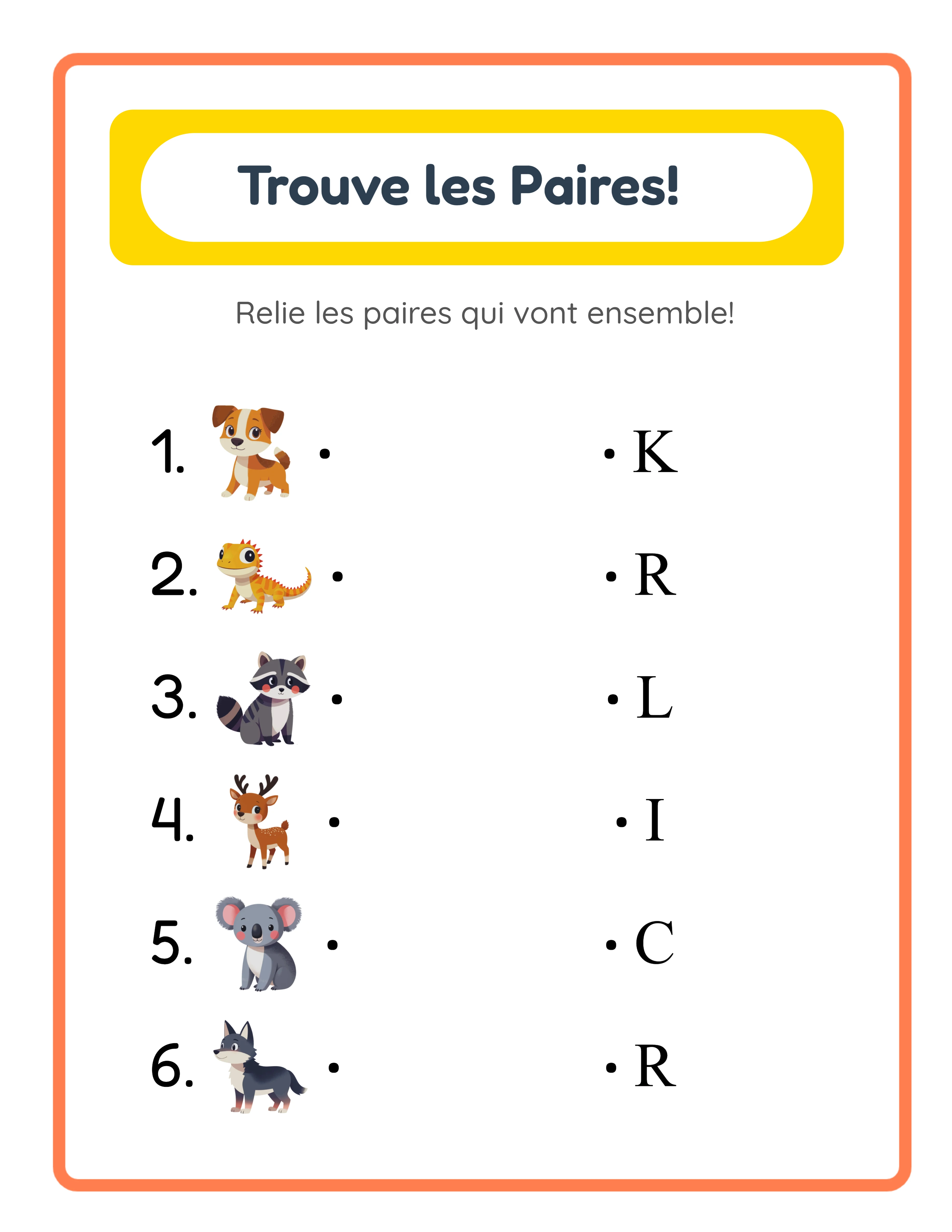 Créez des fiches d'association professionnelles où les utilisateurs relient des paires en traçant des lignes entre deux colonnes — avec quatre modes d'association distincts dans un seul générateur. Le mode Lettre Initiale place les images à gauche et leur première lettre à droite, avec trois sous-modes : Thème et Images Aléatoires choisit un thème et des images automatiquement, Aléatoire depuis le Thème Choisi vous permet de choisir le thème, et Sélectionner des Images Spécifiques vous donne un contrôle manuel sur chaque image. Basculez entre l'affichage en majuscules ou minuscules pour des fiches adaptées à l'âge. Le mode Image+Mot affiche des paires d'images étiquetées des deux côtés pour le renforcement du vocabulaire. Le mode Image/Mot Mixte utilise des sélecteurs déroulants par ligne pour que chaque côté puisse afficher indépendamment une image ou un mot, créant une difficulté variée au sein d'une même fiche. Le mode Mot Personnalisé associe les images à vos propres termes d'association pour la pratique de l'orthographe, les quiz de vocabulaire ou les exercices de langues étrangères. Configurez 4, 5 ou 6 paires par fiche (6 par défaut) pour contrôler la difficulté et la densité visuelle. Activez les numéros d'éléments (activés par défaut) pour ajouter des chiffres devant chaque paire et les puces décoratives (activées par défaut) pour un formatage visuel soigné — les deux se contrôlent indépendamment. Chaque fiche inclut un en-tête auto-généré localisé " Trouve les Paires ! " avec un fond en pastille jaune (#FFD700), un cadre de bordure corail (#FF7F50, épaisseur 8px), un titre en Fredoka (700) et une description en Quicksand (500), automatiquement traduit dans les 11 langues prises en charge. Le système double canevas génère simultanément un onglet fiche de travail et un onglet corrigé — le corrigé trace des lignes de liaison horizontales (#555, épaisseur de trait 2) entre les bonnes correspondances, sans aucun travail manuel de votre part. Ce générateur est sensible à la langue : les modes Lettre Initiale et Image+Mot utilisent les noms localisés des images, donc changer de langue modifie les mots et les premières lettres sur la fiche. Parcourez 104 collections thématiques avec plus de 3 100 illustrations. Appliquez des thèmes de fond et de bordure avec des curseurs d'opacité indépendants (0–1, pas de 0,05). Ajoutez des champs nom et date avec une simple case à cocher. Exportez quatre fichiers par session : fiche JPEG, fiche PDF, corrigé JPEG et corrigé PDF — tous à 300 DPI. Choisissez Letter, A4, Carré (1200×1200) ou des dimensions personnalisées avec une option niveaux de gris pour une sortie économique en encre. Éditez tout sur le canevas Fabric.js avec 7 polices, contour de texte 0–10, outils d'alignement, calques, verrouillage, zoom 25 %–300 % et annuler/rétablir 20 états. L'essai gratuit inclut toutes les fonctionnalités avec un filigrane sur les téléchargements. Achetez une licence pour supprimer le filigrane et vendre à usage commercial.