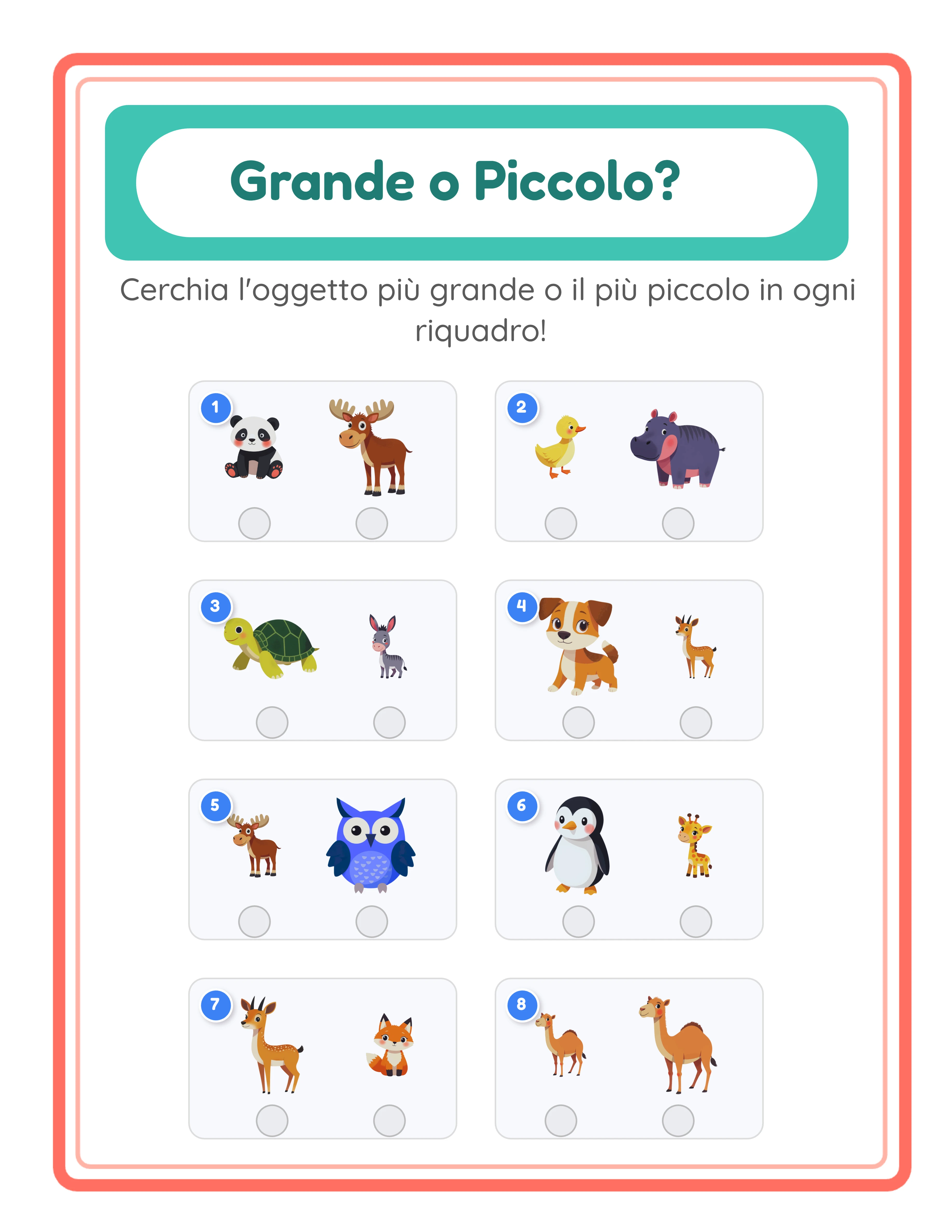 Cinque tipi di domande — cerchiare il più grande, cerchiare il più piccolo, cerchiare il medio, numerare dal più piccolo al più grande, numerare dal più grande al più piccolo — con modalità immagini identiche e diverse per la discriminazione visiva delle dimensioni.
