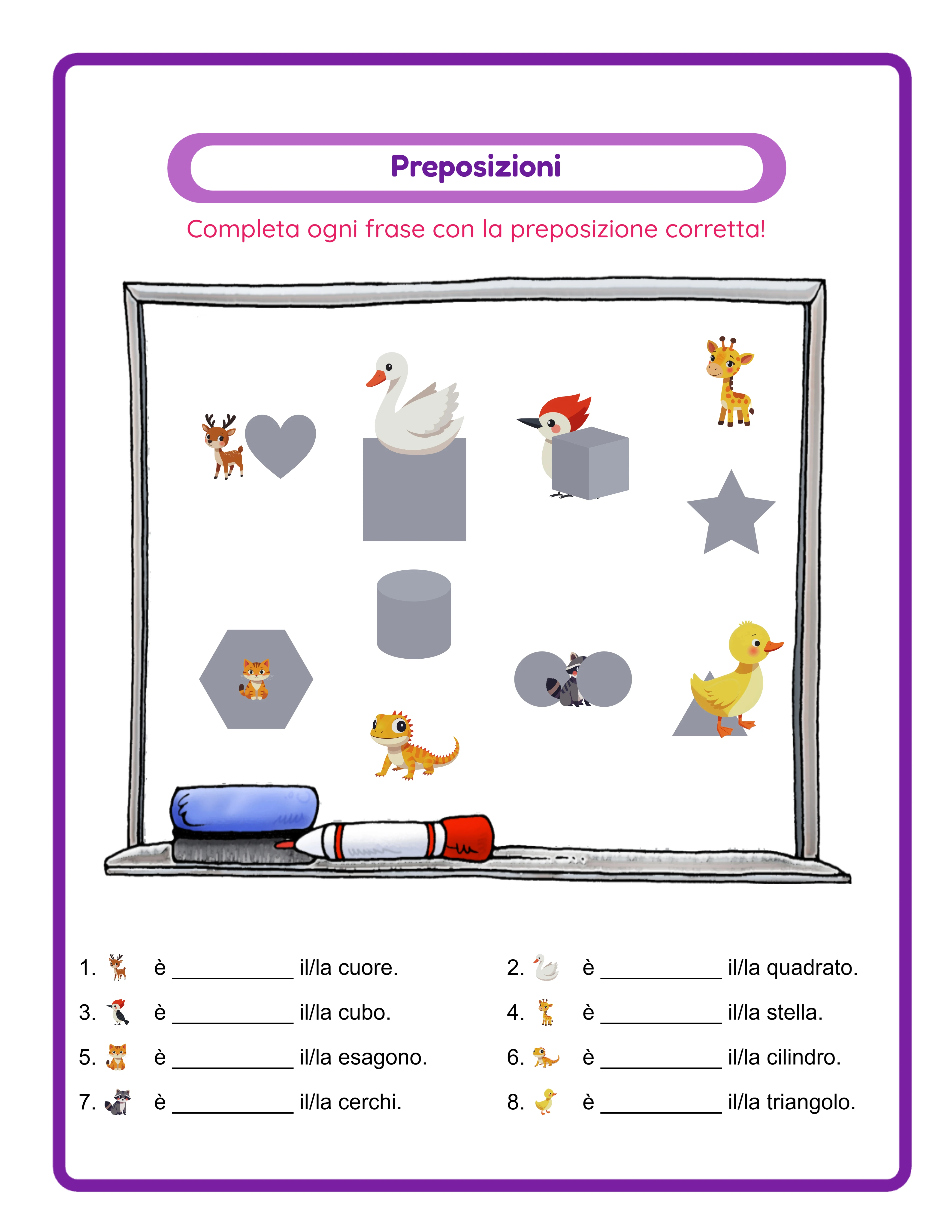 Attiva la scala di grigi prima di scaricare per versioni in bianco e nero a risparmio d'inchiostro ideali per la stampa in serie online e gli interni Amazon KDP. Le schede sulle preposizioni in scala di grigi mantengono piena funzionalità perché gli esercizi si basano sul posizionamento spaziale degli oggetti, non sul colore.