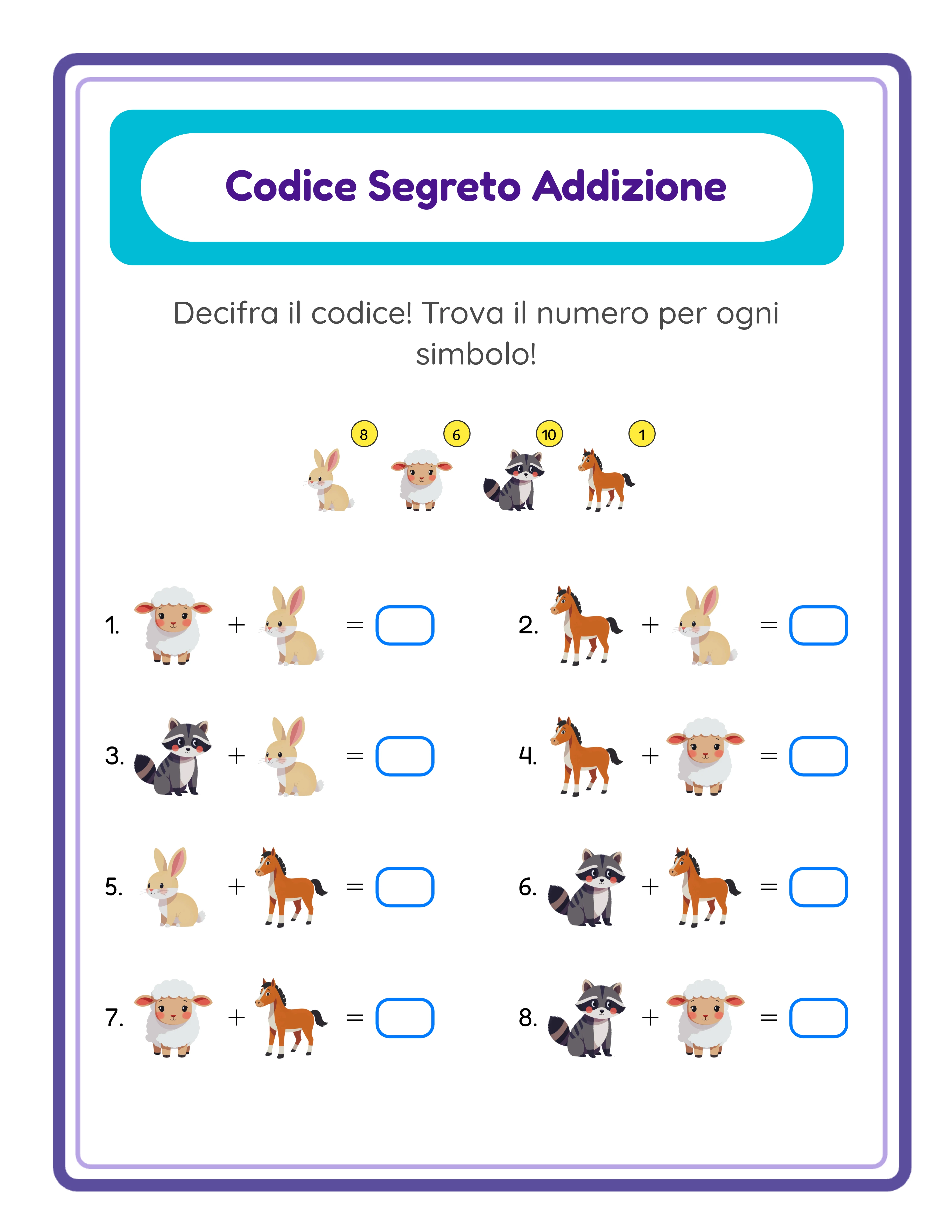 Questo non è un semplice foglio di addizioni — è una sfida di decrittazione. Ogni puzzle nasconde numeri dietro simboli-immagine e gli utenti devono risolvere equazioni di addizione per scoprire quale numero corrisponde a ciascuna figura. Nella Modalità Normale ogni simbolo rappresenta una cifra unica. Attiva la Modalità Rivela Parola e ogni equazione risolta svela una lettera di una parola segreta, mentre lettere distratrici tengono gli utenti sulle spine. Scegli tra oltre 100 temi con più di 3.100 illustrazioni, regola il numero di simboli e la complessità degli addendi e scarica PDF pronti per la stampa o JPEG ad alta risoluzione. Supporta 11 lingue con alfabeti specifici per ogni lingua — la modalità Rivela Parola in italiano funziona nativamente con accenti come à, è, é, ì, ò e ù. Perfetto per venditori Etsy che creano puzzle matematici di nicchia, editori Amazon KDP che pubblicano libri di attività crittaritmetiche e venditori che cercano esercizi coinvolgenti. La prova gratuita include una filigrana sui download. Acquista una licenza per rimuovere la filigrana e vendere le tue creazioni su qualsiasi piattaforma.