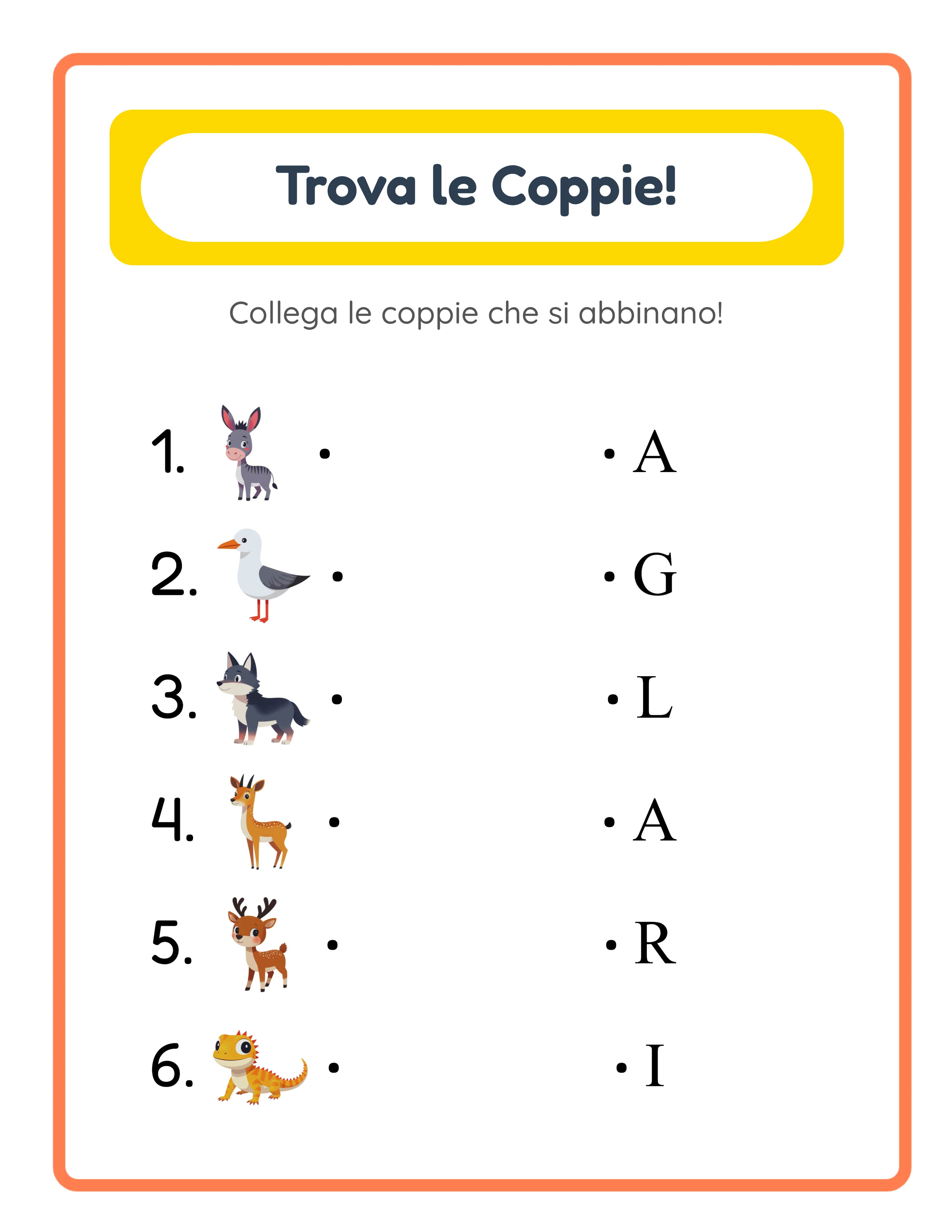 Crea schede di abbinamento professionali traccia-una-linea dove gli utenti collegano le coppie disegnando linee tra due colonne — con quattro modalità distinte in un unico generatore. La modalità Lettera Iniziale posiziona le immagini a sinistra e le loro lettere iniziali a destra, con tre sotto-modalità: Tema e Immagini Casuali sceglie un tema e le immagini automaticamente, Immagini Casuali dal Tema Scelto ti permette di scegliere il tema, e Seleziona Immagini Specifiche ti dà il controllo manuale su ogni immagine. Alterna tra visualizzazione maiuscola e minuscola per schede adatte all'età. La modalità Immagine+Parola mostra coppie di immagini con etichette su entrambi i lati per il rinforzo del vocabolario. La modalità Immagine/Parola Misto usa selettori a tendina per ogni riga così ogni lato può mostrare indipendentemente un'immagine o una parola, creando difficoltà variata all'interno di una singola scheda. La modalità Parola Personalizzata abbina le immagini con i tuoi termini digitati per esercizi di ortografia, quiz di vocabolario o esercizi di lingua straniera. Configura 4, 5 o 6 coppie per scheda (predefinito 6) per controllare la difficoltà e la densità visiva. Attiva i numeri elemento (predefinito ON) per aggiungere numeri prima di ogni coppia e mostra punti/pallini (predefinito ON) per la formattazione decorativa — entrambi controllabili indipendentemente. Ogni scheda include un'intestazione localizzata "Trova le Coppie!" generata automaticamente con sfondo a pillola gialla (#FFD700), cornice a bordo corallo (#FF7F50, tratto 8px), titolo in Fredoka (700) e descrizione in Quicksand (500), tradotta automaticamente in tutte le 11 lingue supportate. Il sistema a doppio canvas genera simultaneamente sia la scheda utente che la scheda con chiave di risposta — la chiave di risposta disegna linee di collegamento orizzontali (#555, larghezza tratto 2) tra le corrispondenze corrette così non devi mai crearla manualmente. Questo generatore è sensibile alla lingua: le modalità Lettera Iniziale e Immagine+Parola usano i nomi localizzati delle immagini, quindi cambiando lingua cambiano le parole e le lettere iniziali sulla scheda. Sfoglia 104 collezioni tematiche con oltre 3.100 illustrazioni. Applica temi di sfondo e temi di bordo con cursori di opacità indipendenti (0–1, passo 0,05). Aggiungi campi nome utente e data con una singola casella di controllo. Esporta quattro file per sessione: scheda JPEG, scheda PDF, chiave di risposta JPEG e chiave di risposta PDF — tutto a 300 DPI. Scegli formato Letter, A4, Quadrato (1200×1200) o dimensioni personalizzate con l'opzione scala di grigi per stampe a risparmio d'inchiostro. Modifica tutto sul canvas Fabric.js con 7 font, contorno testo 0–10, strumenti di allineamento, livelli, blocca/sblocca, zoom 25%–300% e annulla/ripeti 20 stati. La prova gratuita include ogni funzionalità con una filigrana sui download. Acquista una licenza per rimuovere la filigrana e vendere commercialmente.