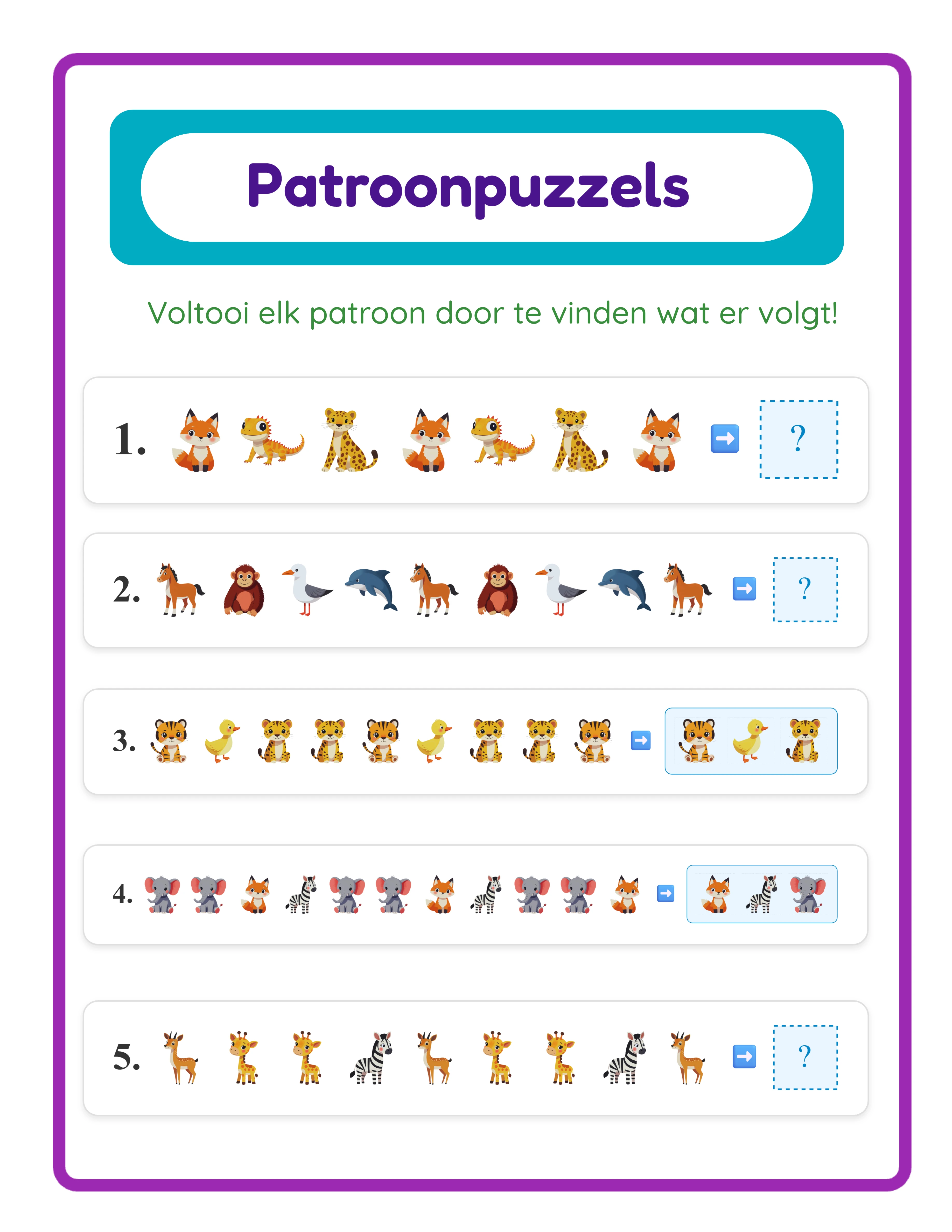 Een titel als "Patroonoefening — Wat Komt Er Daarna?" of "Maak het Patroon Af" bovenaan de pagina.