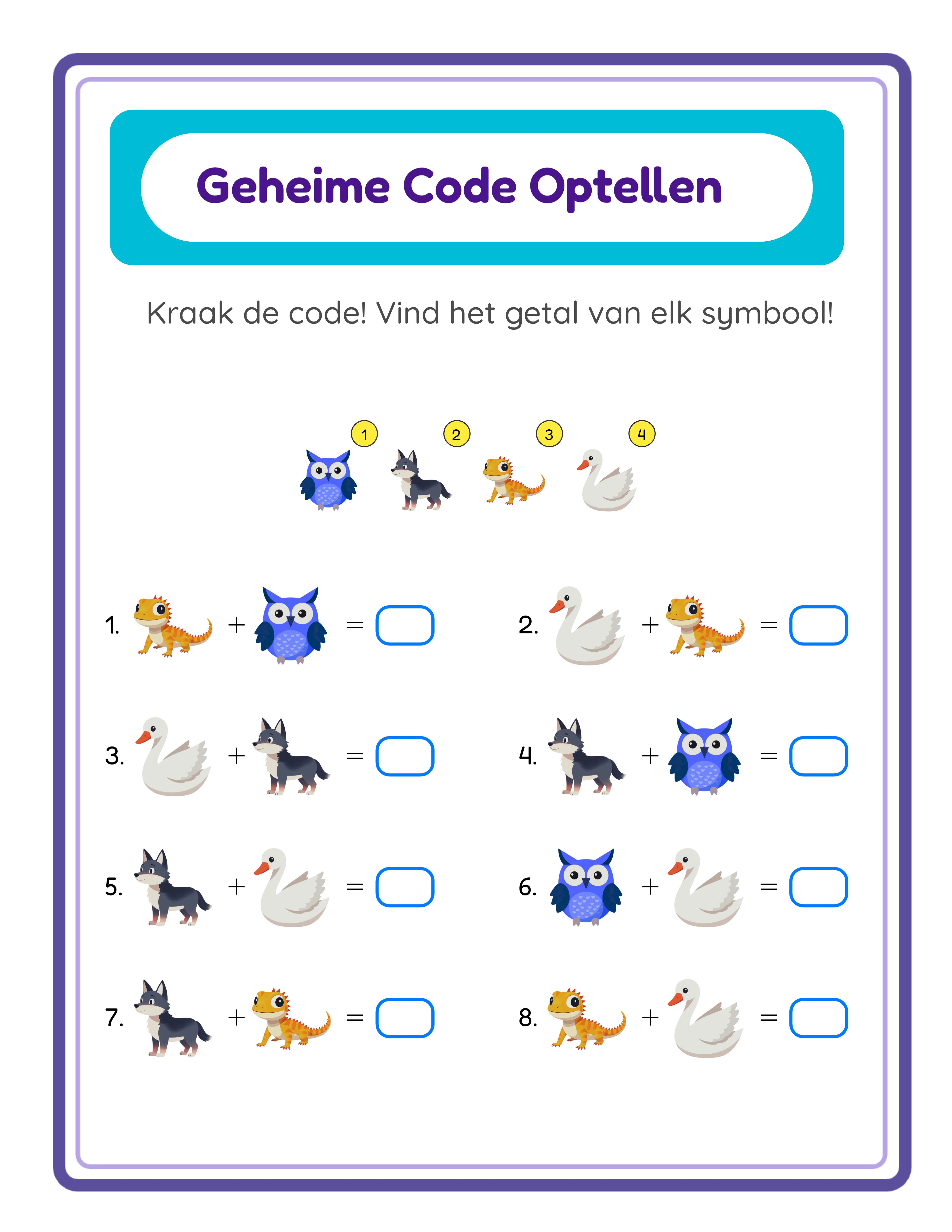 Dit is geen gewoon optelwerkblad — het is een codekraak-uitdaging. Elke puzzel verbergt getallen achter afbeeldingssymbolen, en gebruikers moeten optelsom men oplossen om uit te vinden welk getal bij welk plaatje hoort. In de Normale Modus staat elk symbool voor een uniek cijfer. Schakel over naar Woord Onthullen Modus en elke opgeloste vergelijking onthult een letter van een geheim woord, met afleidingsletters die gebruikers aan het raden houden. Kies uit meer dan 100 beeldthema's, pas het aantal symbolen en de complexiteit van de optellers aan, en download printklare PDF's of JPEG's. Ondersteunt 11 talen met taalgebonden alfabetten — Nederlandse puzzels gebruiken het volledige Nederlandse alfabet en Nederlandse woordenschat. De gratis proefversie bevat een watermerk op downloads. Koop een licentie om het watermerk te verwijderen en commercieel te verkopen.