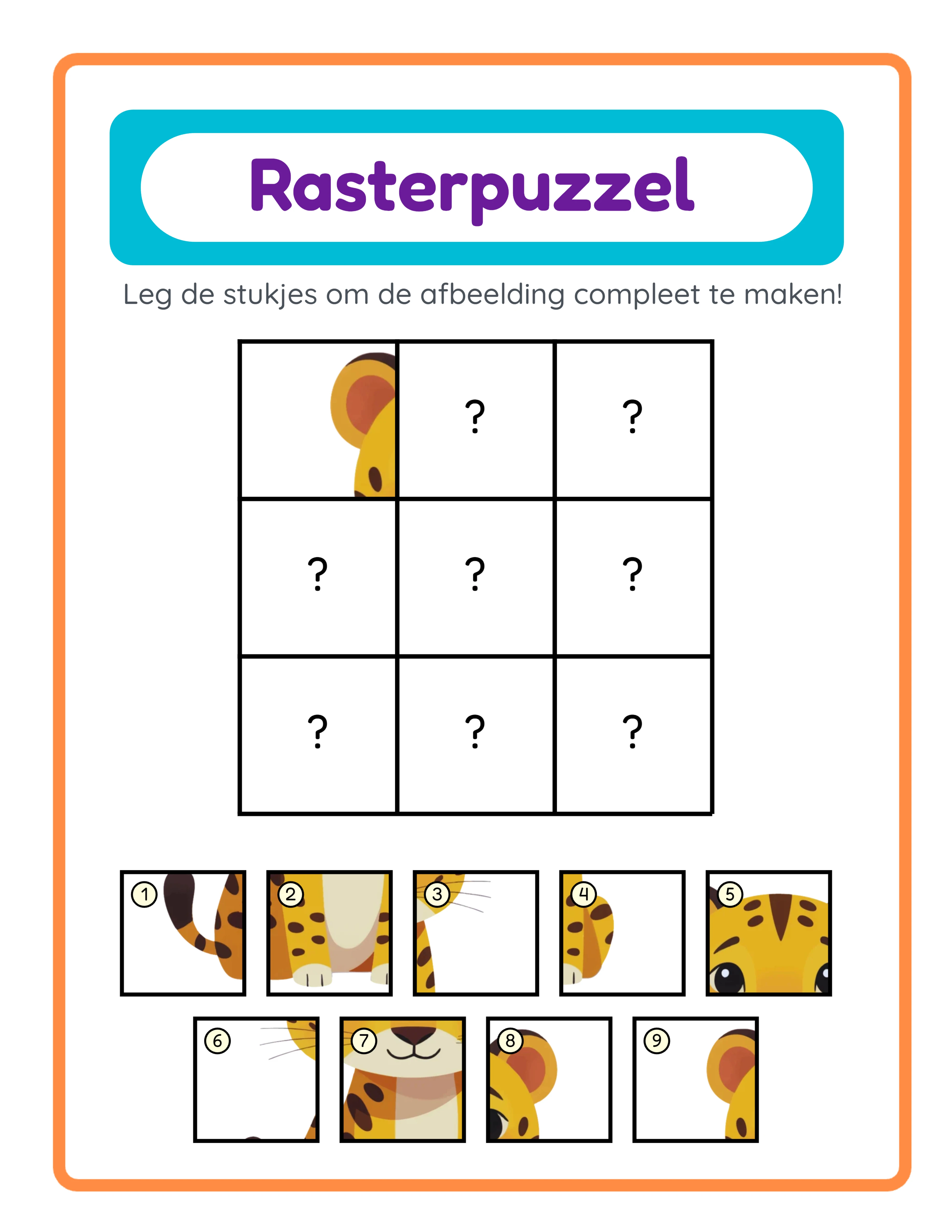 Maak professionele rasterpuzzels waarbij één afbeelding wordt verdeeld in een raster van tegels en gebruikers genummerde tegels terugkoppelen naar hun correcte posities — een ruimtelijk redeneerpuzzel gebouwd vanuit één afbeelding. Configureer het raster van 2×2 tot 4×4 (2–4 rijen × 2–4 kolommen, standaard 3×3) om puzzels te maken van 4 tegels tot 16 tegels. Stel 1–5 aanwijzingscellen in (standaard 1) die zichtbaar blijven op het werkblad als hints — minder aanwijzingen betekent moeilijkere puzzels, meer aanwijzingen creëren toegankelijke opwarmers. De app schudt verborgen tegels met Fisher-Yates randomisatie en toont ze in een genummerd palet naast of onder het raster, zodat elke generatie een andere tegelvolgorde produceert zelfs vanuit dezelfde afbeelding en instellingen. gebruikers bestuderen de zichtbare aanwijzingscellen, bekijken de genummerde tegels in het palet, en schrijven welk nummer in elke lege cel hoort. Het dubbele-canvassysteem genereert zowel een werkblad-tabblad als een antwoordblad-tabblad tegelijkertijd — het antwoordblad toont de volledige onverdeelde afbeelding met genummerde cirkels over elke rastercel (gele achtergrond #ffffe0, zwarte omtrek, Fredoka-lettertype), die precies aangeeft welk paletnummer in elke positie thuishoort. De responsieve indeling past zich automatisch aan: staande pagina's plaatsen het raster bovenaan (45% hoogte) met het palet eronder; liggende pagina's positioneren het raster links (48% breedte) met het palet rechts. Een gestileerde koptekst verschijnt met een cyaankleurige achtergrond (#00BCD4), dieppurperen titel (#6A1B9A) en oranje kaderlijn (#FF8C42) met "Rasterpuzzel" en instructies in de geselecteerde taal. Rasterpuzzel is NIET taalgebonden — de puzzeluitvoer is puur visueel zonder gelokaliseerde woordinhoud op het werkblad zelf, waardoor elk werkblad universeel verkoopbaar is over alle markten zonder vertaling. Blader door 104 thematische collecties met meer dan 3.100 illustraties of upload je eigen PNG-, JPG- of GIF-afbeeldingen voor gepersonaliseerde rasterpuzzels. Pas achtergrondthema's en kaderthema's toe met onafhankelijke dekkingsregelaars (0–1, stap 0,05). Exporteer vier bestanden per sessie: werkblad-JPEG, werkblad-PDF, antwoordblad-JPEG en antwoordblad-PDF — allemaal op 300 DPI. Kies Letter-, A4- of aangepaste paginaformaten met grijstintenmodus voor inktvriendelijke uitvoer. Bewerk alles op het Fabric.js-canvas met 7 lettertypen, tekstomlijning 0–10, uitlijngereedschappen, laagbeheer, vergrendelen/ontgrendelen, zoom 25%–300% en ongedaan maken/opnieuw uitvoeren tot 20 statussen. De gratis proefversie bevat alle functies met een watermerk op downloads. Koop een licentie om het watermerk te verwijderen en commercieel te verkopen.