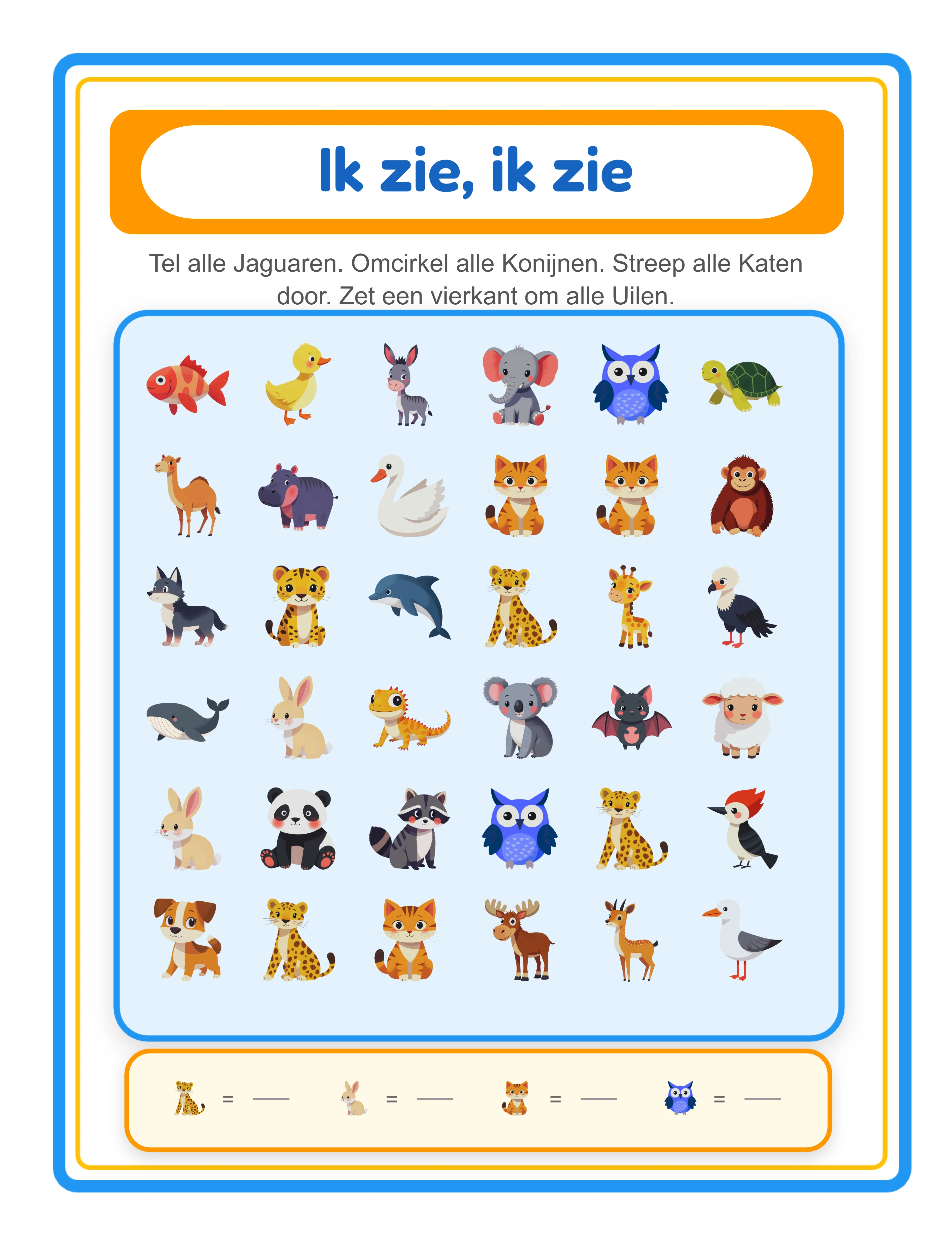 Maak professionele ik zie ik zie en zoek-en-tel werkbladen waarbij gebruikers een verstrooide afbeeldingenscène doorzoeken om specifieke objecten te vinden, omcirkelen, doorstrepen of tellen. De generator biedt twee verschillende activiteitsmodi in één tool. Verborgen Voorwerp modus verstrooit afbeeldingen over een instelbaar raster (5–10 rijen × 5–10 kolommen, standaard 6×6) en laat je tot 4 doelobjecten toewijzen met individuele taaktypen — omcirkel het object, zet er een vierkant omheen, streep het door, of tel hoeveel er verschijnen. Elke cel toont één afbeelding op maximaal 80px. Doelobjecten worden willekeurig verdeeld met 1–5 exemplaren elk, en resterende cellen vullen met afleidingsafbeeldingen uit het thema. Letterherkenning modus toont een taalspecifiek alfabetraster met accentletters — Nederlands A–Z (26 letters), Duits A–Z + ÄÖÜ (29 letters), Spaans A–Z + Ñ (27 letters), Zweeds/Fins A–Z + ÅÄÖ (29 letters), Deens/Noors A–Z + ÆØÅ (29 letters) — weergegeven in 7 kolommen met automatische rijaanpassing. gebruikers selecteren een letter, en de generator maakt een ik zie ik zie scène met afbeeldingen die beginnen met die letter in de geselecteerde taal. De Zoek en Tel Generator is taalgebonden: afbeeldingsnaamlabels op het werkblad worden weergegeven in de geselecteerde taal via het Beeldwoordenschat-systeem. "Kat" verschijnt in het Nederlands, "Cat" in het Engels, "Katze" in het Duits, "Chat" in het Frans — en Letterherkenning beginletters passen dienovereenkomstig aan. Het Commerciële abonnement bevat alleen Engels; Volledige Toegang ontgrendelt alle 11 talen voor gelokaliseerde labels. Het dubbele canvassysteem genereert zowel een werkblad-tabblad als een antwoordblad-tabblad tegelijkertijd. Het antwoordblad reproduceert de exacte werkbladindeling en legt rode visuele annotaties over: cirkels rondom omcirkel-taak objecten, vierkanten rondom vierkant-taak objecten, kruisen over doorstreep-taak objecten, en telweergaven voor tel-taak objecten. Een automatisch gegenereerde koptekst rendert "Ik Zie Ik Zie" of "Letterherkenning" (modusafhankelijk) met een blauw kader (#2196F3), geel binnenaccent, en gelokaliseerde titel en instructies in Fredoka- en Quicksand-lettertypen over alle 11 ondersteunde talen. De app genereert automatisch bij het laden met het dierenthema, 4 willekeurige afbeeldingen, willekeurige taaktypen en een 6×6 raster voor een directe preview. Blader door 104 thematische collecties met meer dan 3.100 illustraties of upload eigen afbeeldingen. Pas achtergrondthema's en kaderthema's toe met onafhankelijke dekkingsregelaars. Voeg aangepaste tekst toe met 7 lettertype-opties en tekstomlijning 0–10. Schakel naam- en datumvelden in voor gebruikeridentificatie. Exporteer printklare PDF's en JPEG's op 300 DPI (6× vermenigvuldiger) in Standaard (800×1000), Letter, A4, Vierkant (1200×1200) of aangepaste afmetingen. Schakel grijstinten in voor inktvriendelijke uitvoer. De gratis proefversie bevat alle functies met een watermerk op downloads. Koop een licentie om het watermerk te verwijderen en commercieel te verkopen.