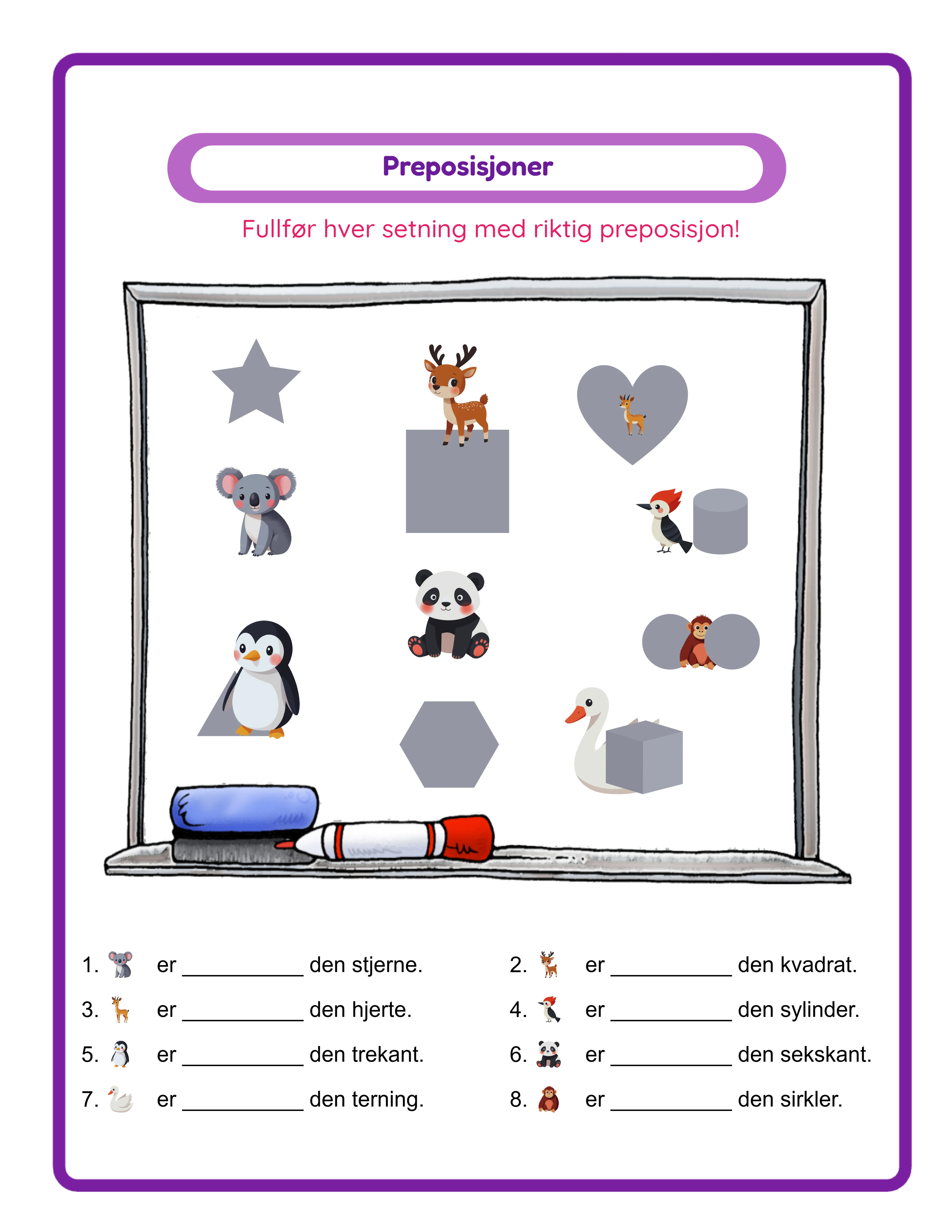 Åtte romlige preposisjoner møter bilde-og-form øvelser — bygg romlig ordforråd, setning for setning.
