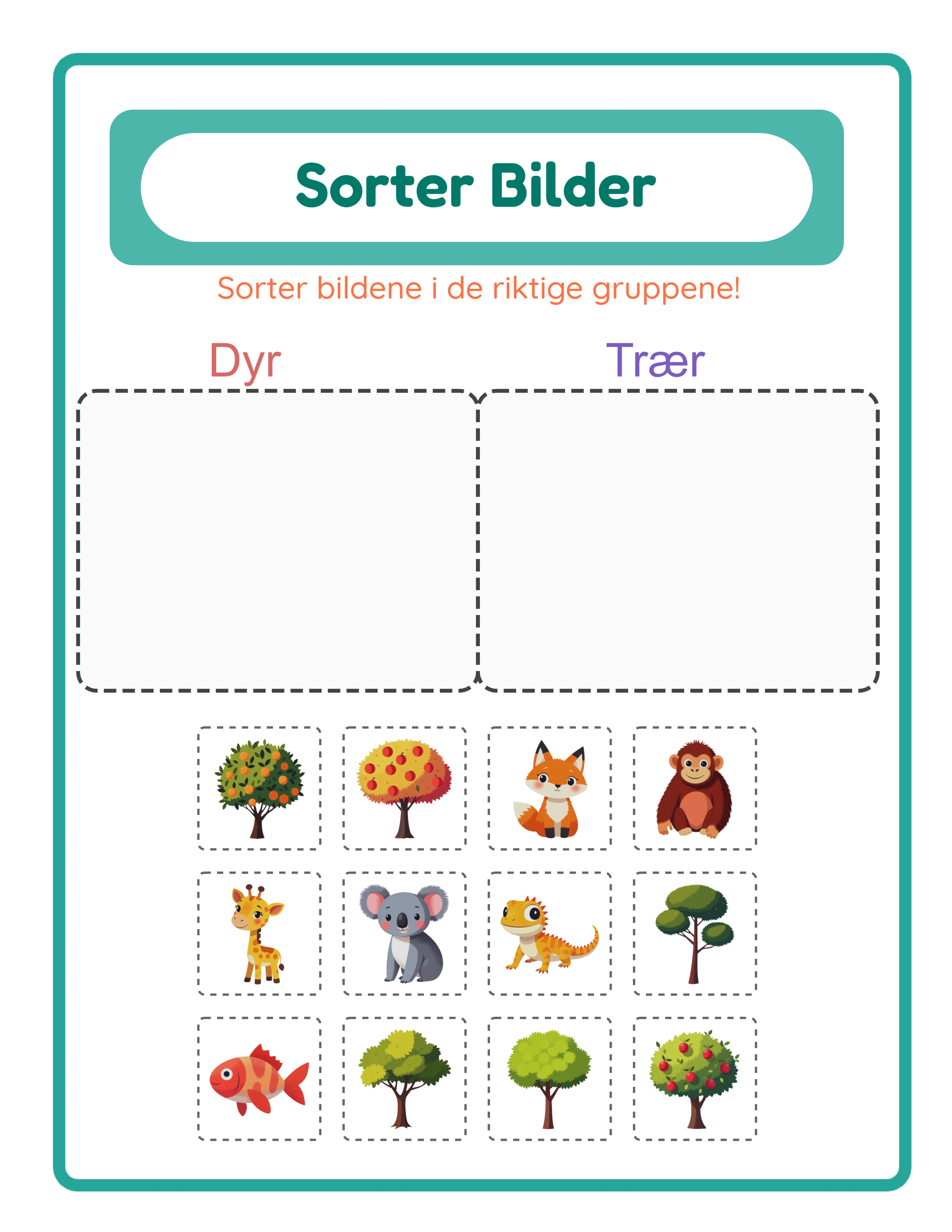 Lag profesjonelle sorteringsarbeidsark der brukerne klipper bilder ut fra et blandet rutenett og klassifiserer dem i to kategorier — venstre og høyre. Velg temamodus for å autofylle kategorier: velg et venstre tema og et høyre tema, appen henter 4–6 tilfeldige bilder per tema. Eller bytt til manuell modus for å håndvelge individuelle bilder og tildele hver til venstre eller høyre. Hvert arbeidsark har to side-om-side stiplede kategorirammer med #FAFAFA-fyll øverst og et blandet utklippsrutenett nedenfor med hvite celler, stiplede #666-kanter, 4px avrundede hjørner og 3–4 kolonner. Konfigurer 4–12 totale bilder med 2–10 per kategori. Dobbeltarbeidsområde-systemet genererer samtidig arbeidsark og fasit — fasiten viser bilder med 6× størrelse i kategoribokser med maks 2 kolonner, #FAFAFA-fyll, #444-strek og 12px kantradius. Bildesortering Generatoren er språkfølsom: kategorietiketter bruker lokaliserte bildenavn. En lokalisert overskrift gjengis med mintgrønn bakgrunn (#4DB6AC), blågrønn tittel (#00796B) i Fredoka Bold og oransje beskrivelse (#FF7043) i Quicksand. En blågrønn ytre ramme (#26A69A, 8px strek, 12px radius) rammer inn siden. Bla gjennom 104 tematiske samlinger med mer enn 3 100 illustrasjoner eller last opp egne bilder. Bruk bakgrunns- og rammetemaer med uavhengige gjennomsiktighetsskyveknapper. Legg til navn- og datofelter. Eksporter fire filer per økt med 300 DPI. Den gratis prøveversjonen inneholder alle funksjoner med vannmerke. Kjøp en lisens for å fjerne vannmerket og selge kommersielt.