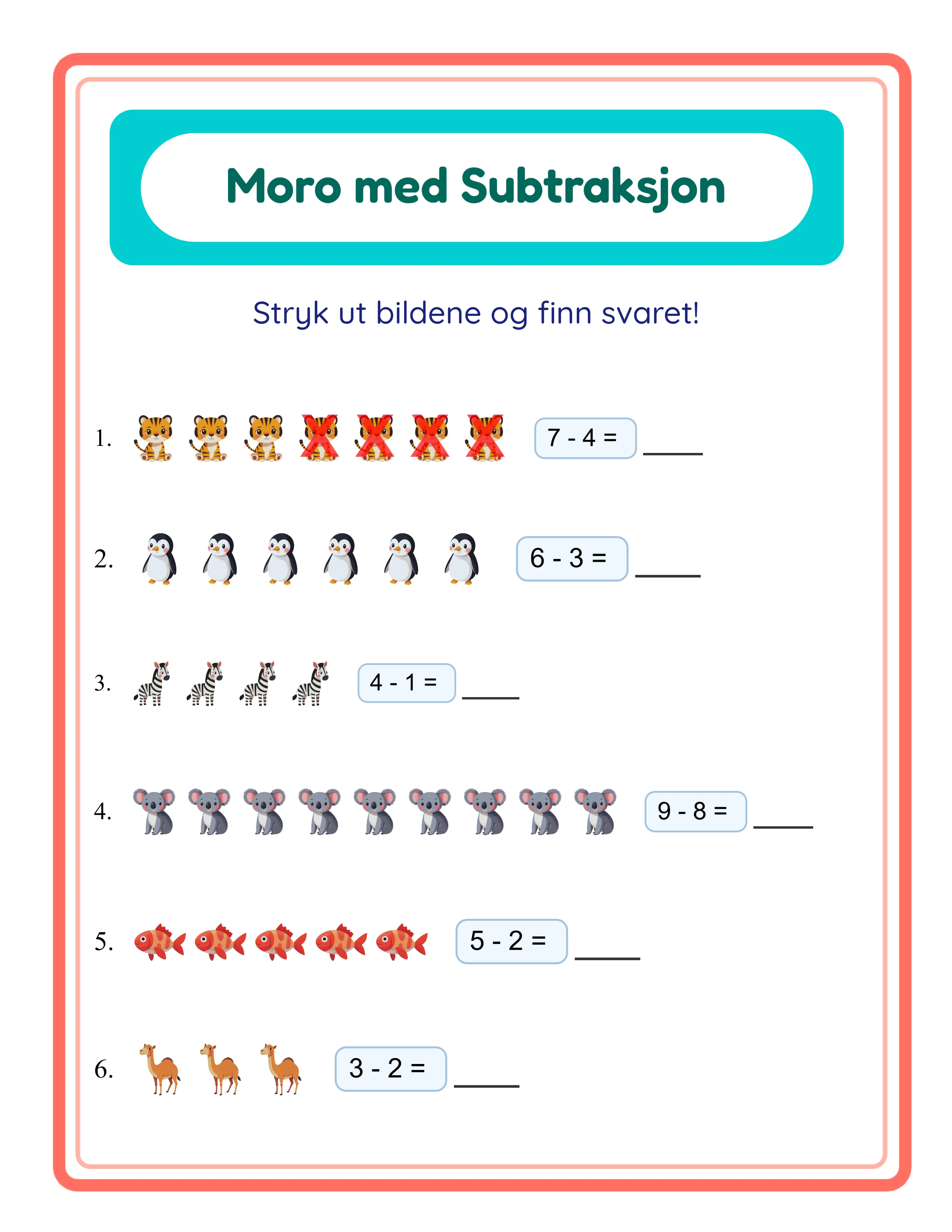 Gjor subtraksjon forståelig med overstrykning-visuelle som barn intuitivt forstår. Dette verktøyet genererer bildebaserte subtraksjons arbeidsark der brukerne stryker bilder over for å finne svaret — den mest naturlige måten å laere fjerne-matematikk på. Velg blant mer enn 100 bildetemaer, still inn subtrahendintervallet ditt, velg blant fire ovelsesmoduser inkl. det unike Overstryknings-formatet, og last ned trykkeklare PDF-er eller hoyopploste JPEG-bilder. Perfekt for Etsy-selgere som bygger nivåinndelte matematikkprodukter, kjopere som lager produktlinjepakker, og KDP-utgivere som setter sammen subtraksjons-arbeidboker. Den gratis proveversjonen inneholder et vannmerke på nedlastinger. Kjop en lisens for å fjerne vannmerket og selge kommersielt.