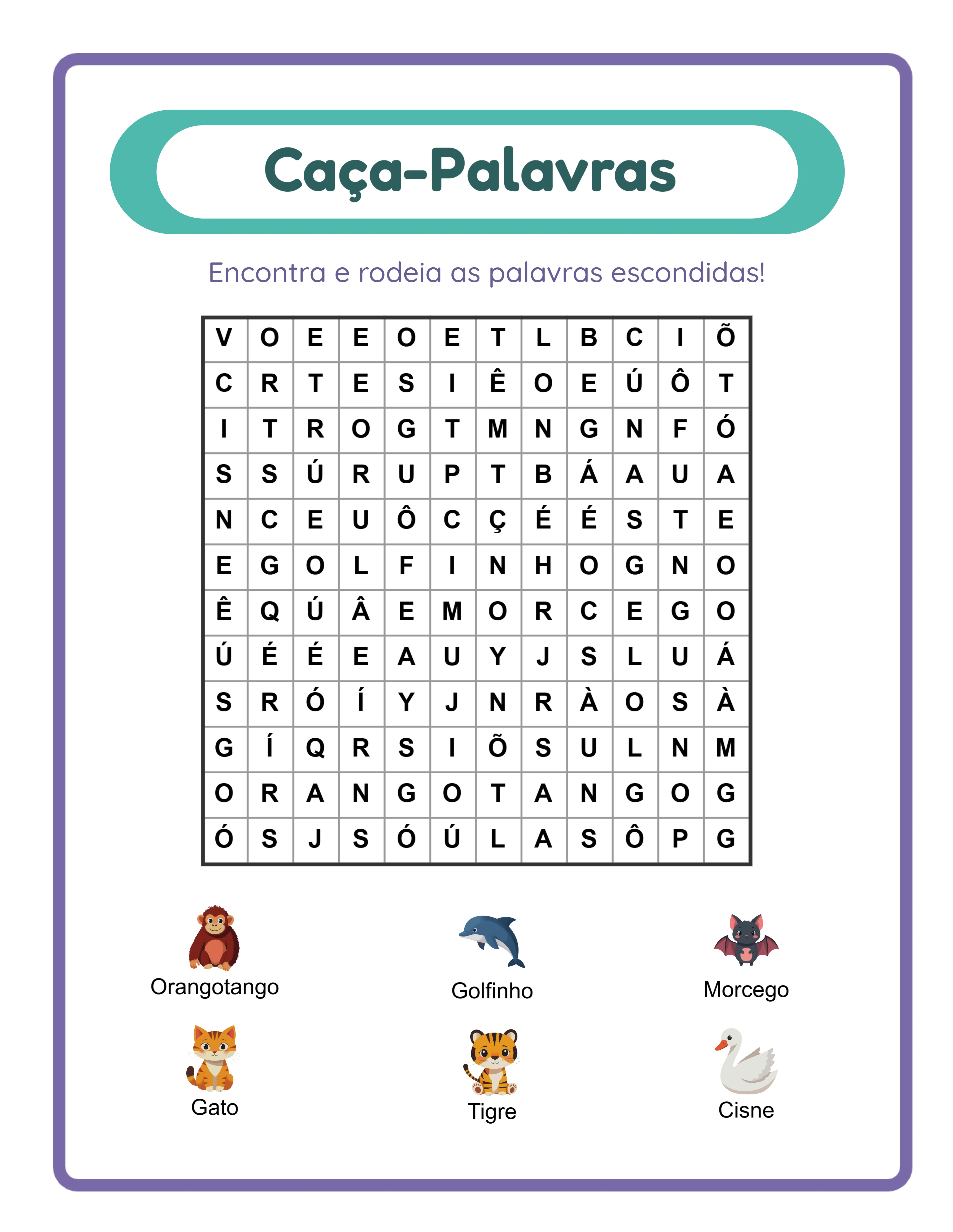 Desenhe fichas profissionais de caça-palavras onde as palavras ocultas estão incorporadas numa grelha de letras aleatórias e os usuários percorrem linhas, colunas e diagonais para as encontrar — o formato de puzzle clássico que nunca sai de moda. Esta ferramenta dá-lhe controlo preciso sobre a dificuldade através de dois eixos independentes: tamanho de grelha (ajustável de 5×5 a 30×30 com linhas e colunas configuráveis de forma independente) e controlos de direção das palavras (palavras em diagonal ativáveis ou desativáveis, palavras invertidas ativáveis ou desativáveis) criando entre duas e oito direções possíveis de colocação. Escolha entre três fontes de conteúdo: o modo Biblioteca de Imagens seleciona de mais de 3100 ilustrações em 104 coleções temáticas, o Modo Edição Manual permite selecionar imagens e personalizar os nomes de exibição, e o modo Lista de Palavras Personalizada permite escrever até 8 palavras diretamente para caça-palavras apenas de texto. Três modos de exibição — Palavras e Imagens, Apenas Imagens e Apenas Palavras — controlam o que aparece como pistas ao lado da grelha. A funcionalidade principal é o preenchimento alfabético adaptado ao idioma: ao mudar de idioma, as letras de preenchimento da grelha mudam para corresponder ao conjunto de caracteres desse idioma com distribuições de frequência ponderadas. As grelhas em português incluem ã, õ, ç, â, á, é, í, ó, ú a frequências naturais. As grelhas em alemão incluem ä, ö, ü e ß. As grelhas em francês incluem é, è, ç, à. Cada idioma recebe caracteres de preenchimento autênticos, tornando os puzzles linguisticamente genuínos em vez de gerados com letras inglesas. Um gabarito com código de cores destaca cada palavra encontrada numa de seis cores alternadas — rosa, azul, verde, dourado, coral e lavanda — para verificação visual instantânea. Exporte PDFs e imagens JPEG prontos para impressão a mais de 400 DPI nos formatos Carta, A4 ou dimensões personalizadas. Escolha entre 7 famílias tipográficas, adicione campos de nome e data do usuário, ative o modo escala de cinzentos para impressão económica e use o canvas completo Fabric.js para reposicionar cada elemento. O teste grátis inclui uma marca d'água nos downloads. Adquira uma licença para remover a marca d'água e vender com uso comercial.
