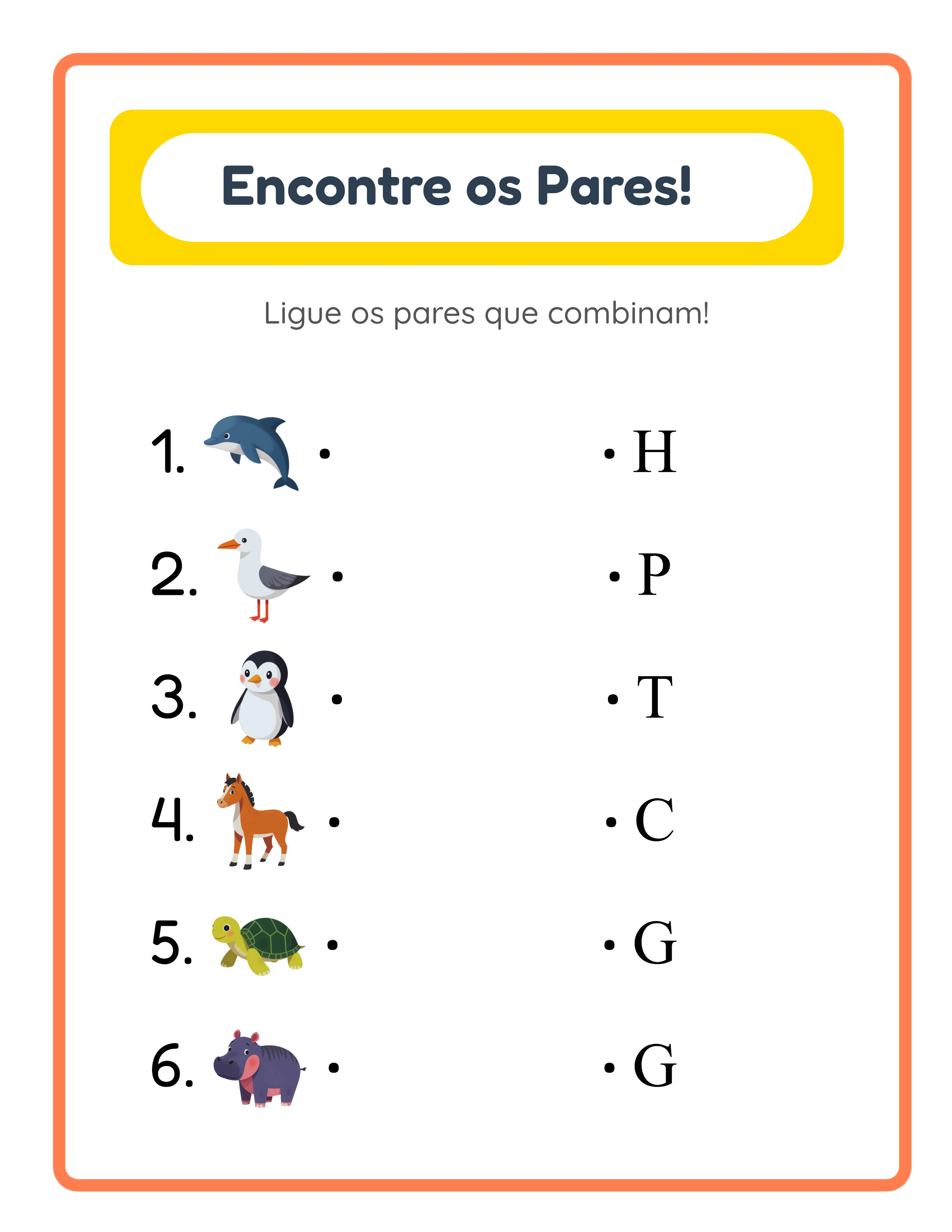 Crie fichas profissionais de associação onde os usuários ligam pares desenhando linhas entre duas colunas — com quatro modos de associação distintos num único gerador. O modo Letra Inicial coloca imagens à esquerda e as suas primeiras letras à direita, com três sub-modos: Tema e Imagens Aleatórias seleciona um tema e imagens automaticamente, Aleatório do Tema Escolhido permite-lhe escolher o tema, e Selecionar Imagens Específicas dá-lhe controlo manual sobre cada imagem. Alterne entre maiúsculas ou minúsculas para fichas adequadas à idade. O modo Imagem+Palavra mostra pares de imagens legendadas em ambos os lados para reforço de vocabulário. O modo Imagem/Palavra Misto usa menus suspensos por linha para que cada lado mostre independentemente uma imagem ou uma palavra, criando dificuldade variada dentro de uma única ficha. O modo Palavra Personalizada associa imagens com os seus próprios termos escritos para prática de ortografia, exercícios de vocabulário ou exercícios de línguas estrangeiras. Configure 4, 5 ou 6 pares por ficha (predefinição 6) para controlar a dificuldade e densidade visual. Ative os números dos itens (predefinição ativada) para adicionar numerais antes de cada par e mostre pontos decorativos (predefinição ativada) para formatação decorativa — ambos controláveis independentemente. Cada ficha inclui um cabeçalho autogerado localizado "Liga!" com fundo de pastilha amarela (#FFD700), moldura de borda coral (#FF7F50, traço de 8px), título em Fredoka (700) e descrição em Quicksand (500), traduzido automaticamente para os 11 idiomas suportados. O sistema de canvas duplo gera simultaneamente um separador de ficha e um separador de gabarito — o gabarito traça linhas de ligação horizontais (#555, largura de traço 2) entre os pares corretos para que nunca o crie manualmente. Este gerador é sensível ao idioma: os modos Letra Inicial e Imagem+Palavra usam nomes de imagens localizados, pelo que mudar de idioma altera as palavras e primeiras letras na ficha. Explore 104 coleções temáticas com mais de 3100 ilustrações. Aplique fundos temáticos e bordas temáticas com controlos de opacidade independentes (0–1, passo 0,05). Adicione campos de nome e data do usuário com uma única caixa de verificação. Exporte quatro ficheiros por sessão: ficha JPEG, ficha PDF, gabarito JPEG e gabarito PDF — tudo a 300 DPI. Escolha Carta, A4, Quadrado (1200×1200) ou tamanhos personalizados com opção de escala de cinzentos para saída económica em tinta. Edite tudo no canvas de Fabric.js com 7 fontes, contorno de texto 0–10, ferramentas de alinhamento, camadas, bloquear/desbloquear, zoom 25 %–300 % e desfazer/refazer 20 estados. O teste grátis inclui todas as funcionalidades com uma marca d'água nos downloads. Adquira uma licença para remover a marca d'água e vender com uso comercial.