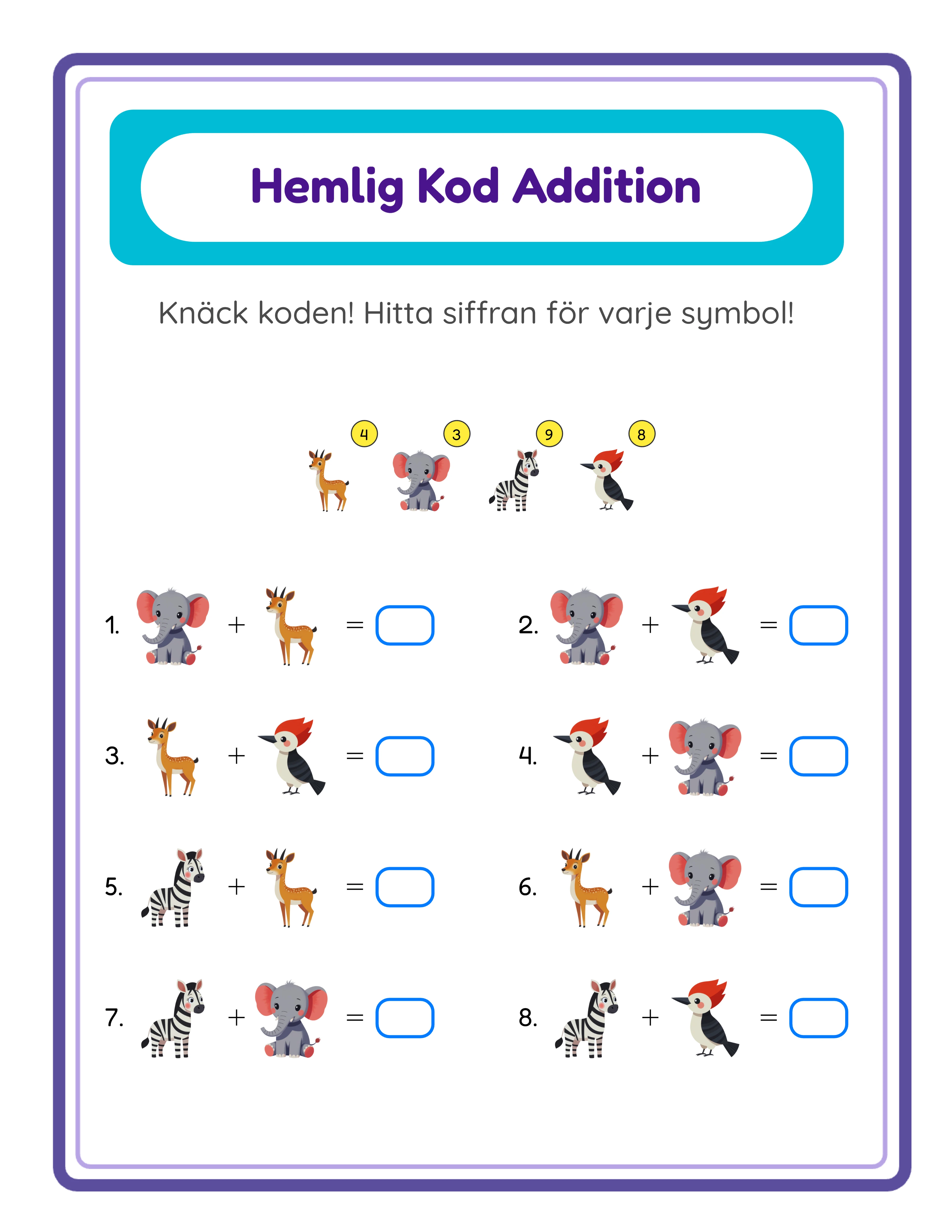Skapa uppgifter där barn löser plusstycken för att avslöja hemliga meddelanden — prova gratis med vattenmärke.