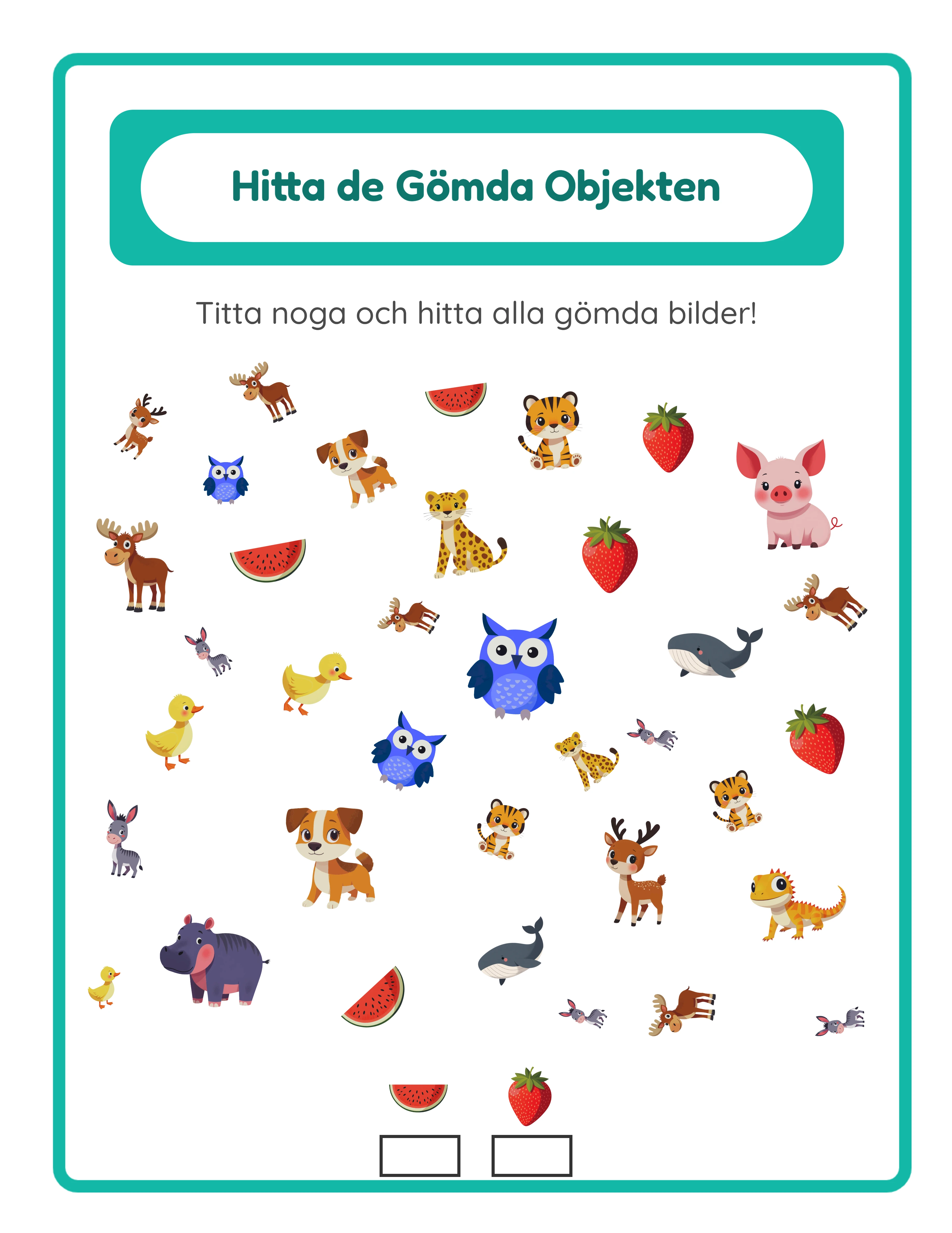 Förskola (3–5 år): Färre distraktioner (8–10), större dolda föremål, minimal överlappning. Hög kontrast mellan dolda föremål och distraktioner.