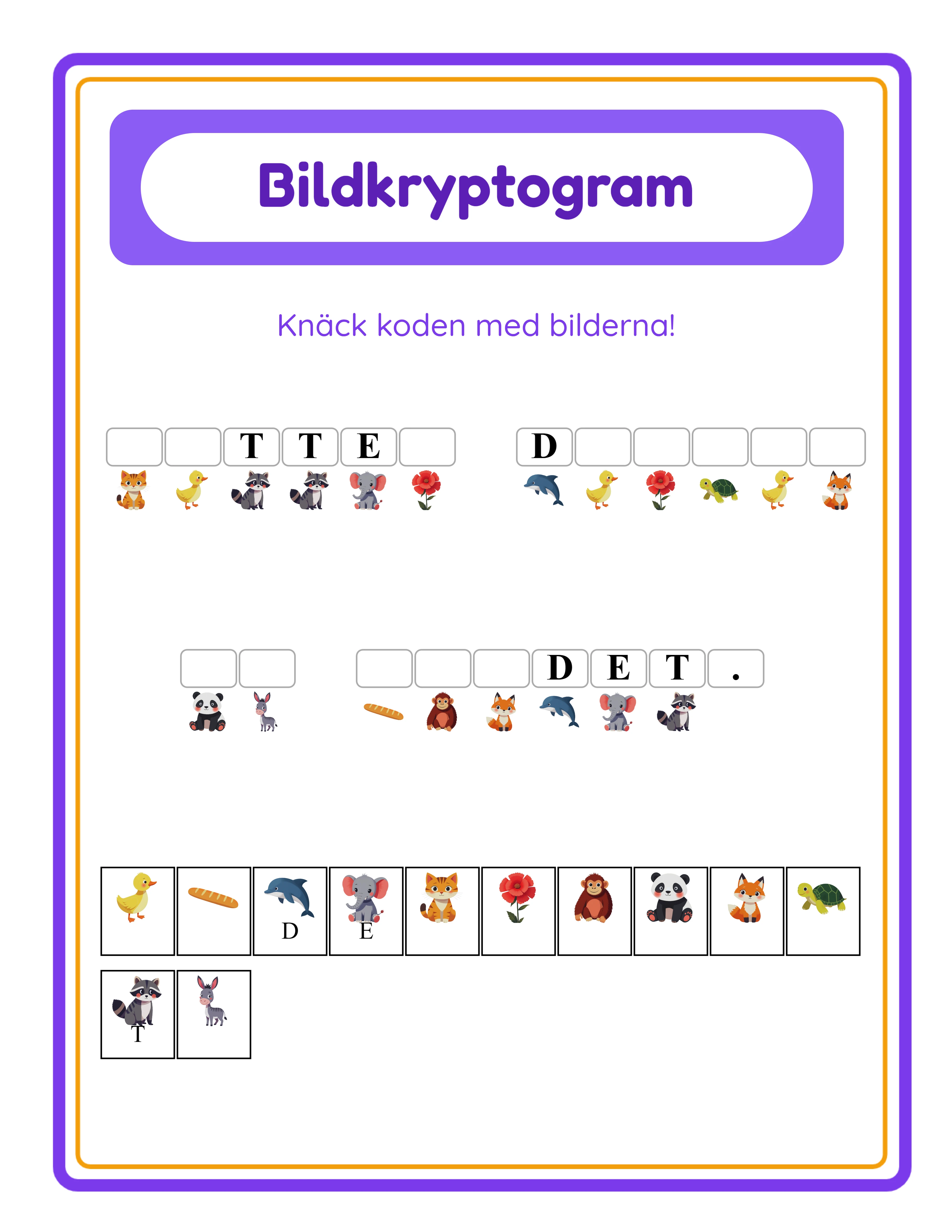 Designa professionella kryptogram arbetsblad byggda på en bildchiffermekanik: varje alfabetsbokstav mappas till en unik bild, och din hemliga fras renderas som en sekvens av bilder som användarna måste avkoda tillbaka till läsbar text. Till skillnad från ordsökningar eller ordmixar som arbetar med enskilda ord kodar Kryptogram-generatorn hela meningar och fraser — användarna knäcker chiffret genom att deducera vilken bild som representerar vilken bokstav, med kontextuella ledtrådar från vanliga ord som "och", "den" och "är" för att påskynda sin kodknäckning. Reglaget Bokstäver att Avslöja (0–10) är den primära svårighetskontrollen: ställ in det på noll för en ren kodknäckningsutmaning utan startinformation, eller skjut upp det till tio för tung stöttning där många bokstav-till-bild-mappningar är förlösta som tips. Autotilldelning hämtar slumpmässiga bilder från valfri av 104 tematiska samlingar (mer än 3 100 illustrationer) för att fylla hela chiffret med ett klick, medan Manuell Tilldelning låter dig handplocka specifika bilder för specifika bokstäver med en fullständig visuell förhandsgranskning av alla mappningar. Ladda upp anpassade bilder för komplett kreativ kontroll. Facit inkluderar en bokstavslegend som visar varje alfabetsbokstav parad med sin tilldelade bild i sorterad ordning — den definitiva lösningsreferensen. Språkkänslighet är inbyggd: byt språk och både den hemliga meddelandetexten och alfabetet ändras. Svenska kryptogram kodar svenska fraser med å, ä, ö i alfabetet; tyska kryptogram inkluderar ä, ö, ü, ß; franska kryptogram använder é, è, ç, à. Varje språkversion är en genuint annorlunda chifferprodukt. Exportera tryckfärdiga PDF:er och JPEG-bilder med 400+ DPI i Letter, A4 eller anpassade storlekar. Välj bland 5 typsnitt, växla gråskala för bläckvänlig utmatning, och använd hela Fabric.js arbetsytan för att flytta varje element. Den gratis provversionen innehåller en vattenstämpel på nedladdningar. Köp en licens för att ta bort vattenstämpeln och sälja kommersiellt.