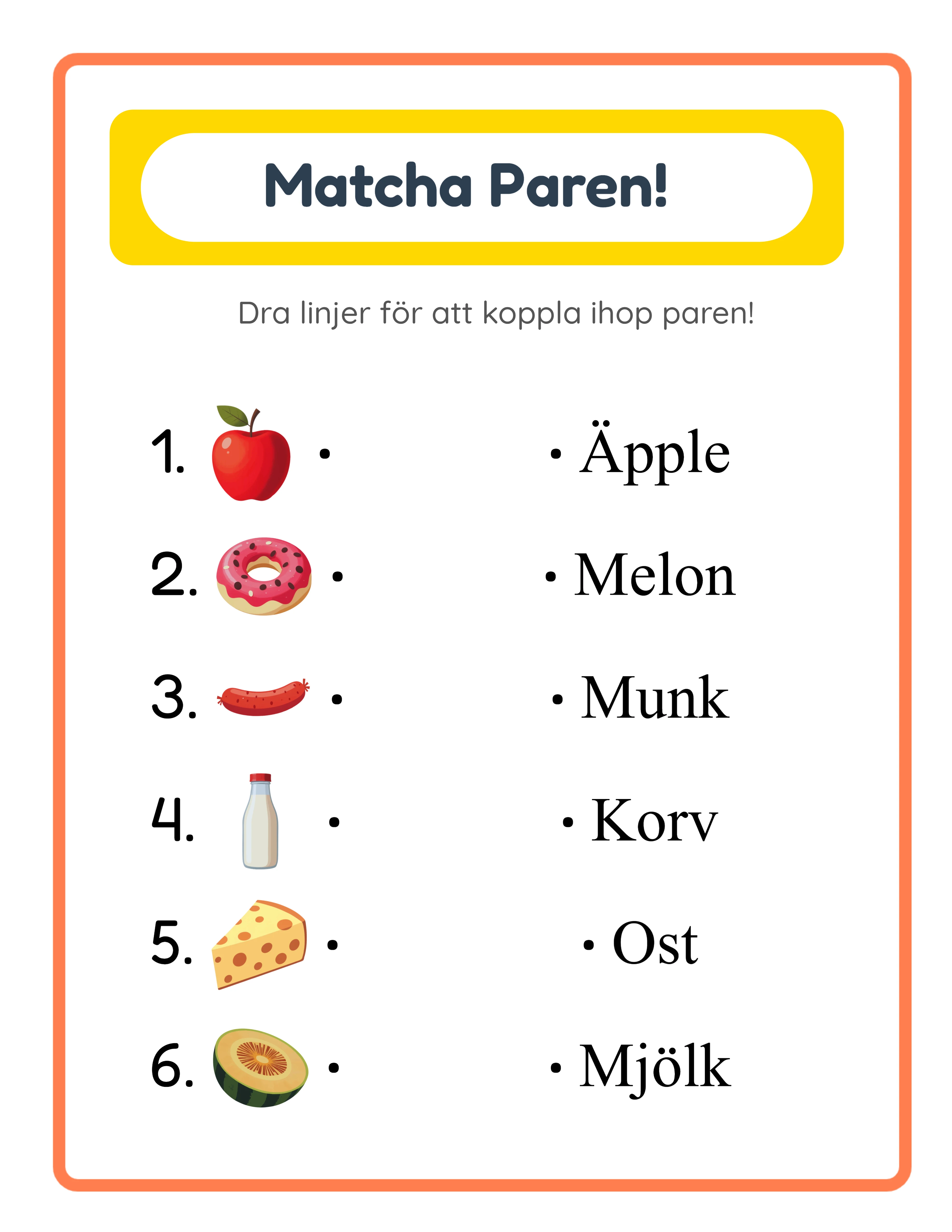 Skapa professionella dra-ett-streck matchnings arbetsblad där användarna kopplar ihop par genom att dra linjer mellan två kolumner — med fyra distinkta matchningslägen i en enda generator. Begynnelsebokstav-läget placerar bilder till vänster och deras första bokstäver till höger, med tre underlägen: Slumpmässigt Tema och Bilder, Slumpmässigt från Valt Tema, och Välj Specifika Bilder. Växla versaler eller gemener. Bild+Ord-läget visar märkta bildpar på båda sidor för vokabulärförstärkning. Bild/Ord Blandat-läget använder per-rad dropdown-väljare. Anpassat Ord-läget parar bilder med dina egna inskrivna matchningstermer. Konfigurera 4, 5 eller 6 par per arbetsblad (standard 6). Växla artikelnummer (standard PÅ) och punktmarkeringar (standard PÅ) oberoende. Varje arbetsblad inkluderar en automatiskt genererad lokaliserad "Para ihop!"-rubrik med gul pillerbakgrund (#FFD700), korall ramkant (#FF7F50, 8px streck), lokaliserad titel i Fredoka (700) och beskrivning i Quicksand (500), automatiskt översatt till alla 11 stödda språk. Dubbelarbetsyte-systemet genererar samtidigt en arbetsbladsflik och en facitflik — facit ritar horisontella kopplingslinjer (#555, streckbredd 2) mellan korrekta matchningar. Denna generator är språkkänslig: Begynnelsebokstav och Bild+Ord-lägen använder lokaliserade bildnamn, så att byta språk ändrar orden och begynnelsebokstäverna — samma kattbild visar K på svenska men C på engelska (Cat) och K på tyska (Katze). Bläddra bland 104 tematiska samlingar med mer än 3 100 illustrationer. Applicera bakgrunds- och ramteman med oberoende opacitetsreglage. Lägg till namn- och datumfält. Exportera fyra filer per session: arbetsblad-JPEG, arbetsblad-PDF, facit-JPEG och facit-PDF — alla med 300 DPI. Välj Letter, A4, Kvadrat eller anpassade sidstorlekar med gråskaleväxling. Den gratis provversionen innehåller alla funktioner med en vattenstämpel. Köp en licens för att ta bort vattenstämpeln och sälja kommersiellt.